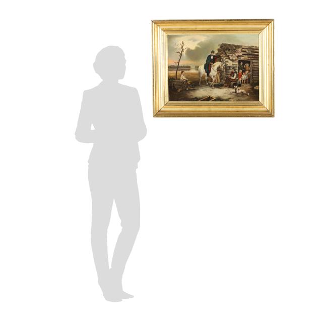 This painting is after the original by Edward Payson Washburn (American, 1831-1860), completed in 1858. The composition is one of the most iconic American genre scenes of the mid-19th century, depicting a humorous frontier encounter between a well-dressed traveler on horseback and a rustic squatter playing a fiddle outside a rough log cabin. The image illustrates the popular tale and tune "The Arkansas Traveler," a story and melody popularized by Colonel Sandford C. Faulkner in the 1840s, in which a traveler wins over a reticent fiddler by completing the tune he has been struggling to play.