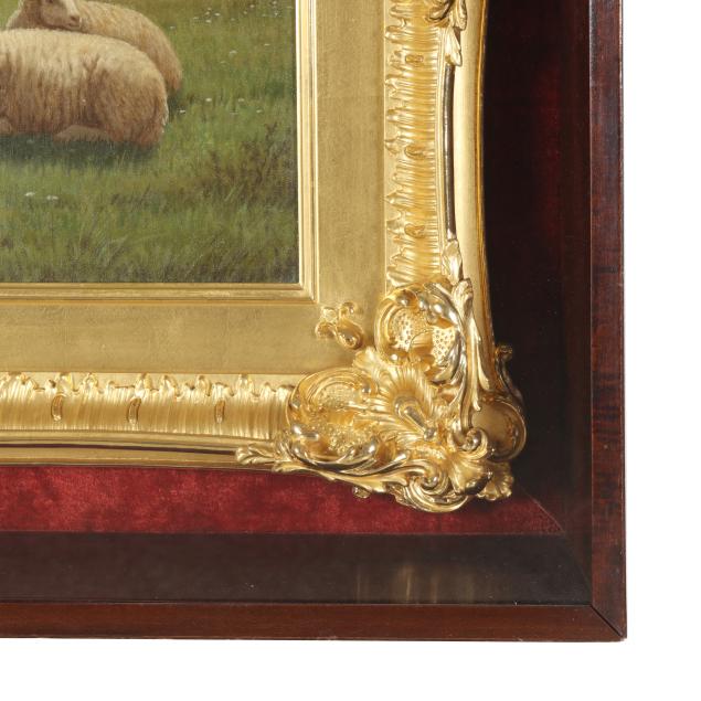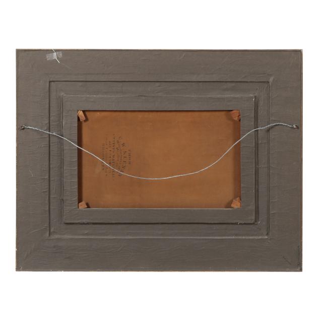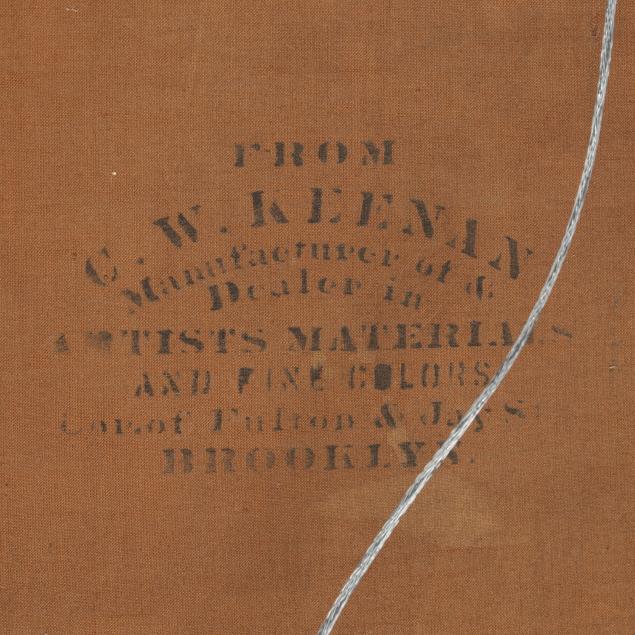 Oil on canvas, signed at lower left, with art supplier's stamp of C. W. Keenan, Brooklyn, New York to verso, presented in an ornate giltwood frame with gallery plaque affixed at lower center, below a wooden shadowbox.