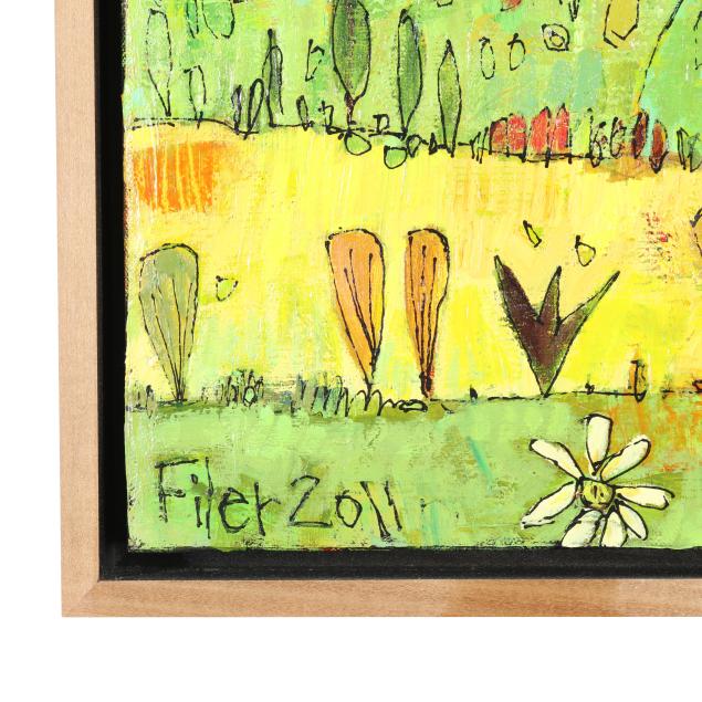 Filer eventually settled in North Carolina. She received her MFA from the University of North Carolina - Chapel Hill. She was a favorite teacher at The ArtsCenter in Carrboro for many years before retiring in 2005. Her joyful paintings have been exhibited extensively throughout the country and are in many prominent public and private collections.