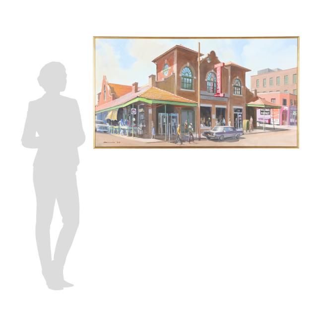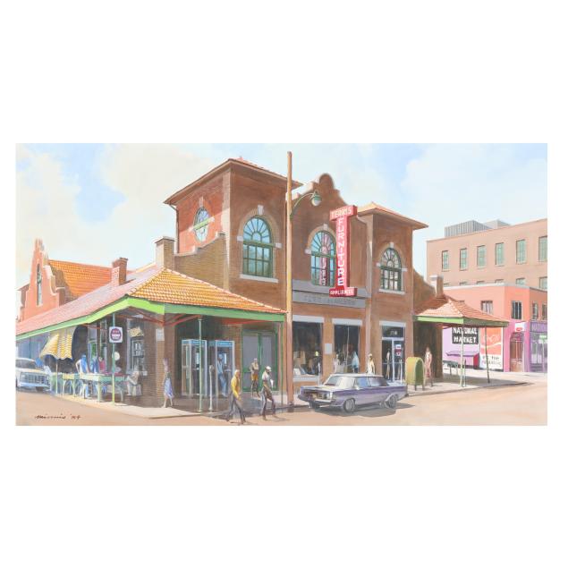 City Market in Raleigh, North Carolina, is a historic public marketplace that opened on October 1, 1914, as part of the Moore Square commercial district. Designed in a Spanish Mission style by architect James Matthew Kennedy, it served for more than four decades as a central farmers market where growers from across eastern North Carolina brought produce, poultry, seafood, and other goods to sell, and where residents socialized under and around Moore Square’s cobblestone streets. With the rise of supermarkets and the opening of a new state farmers market in the 1950s, City Market declined and closed in 1957, later operating as a furniture store. In the 1980s, when this was painted, the city secured funding to recognize and rehabilitate the Market and surrounding buildings, saving it for future generations.