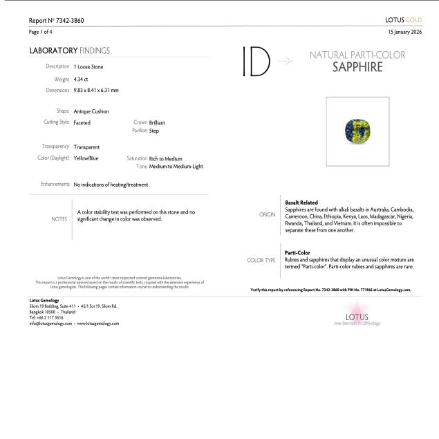 Accompanied by a Lotus Gemology Gold report stating parti-color yellow/blue sapphire with no indications of heating/treatment.