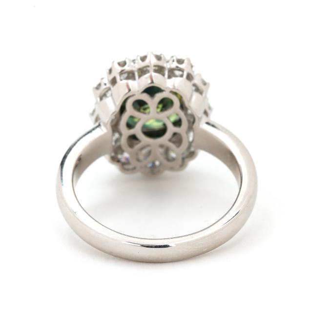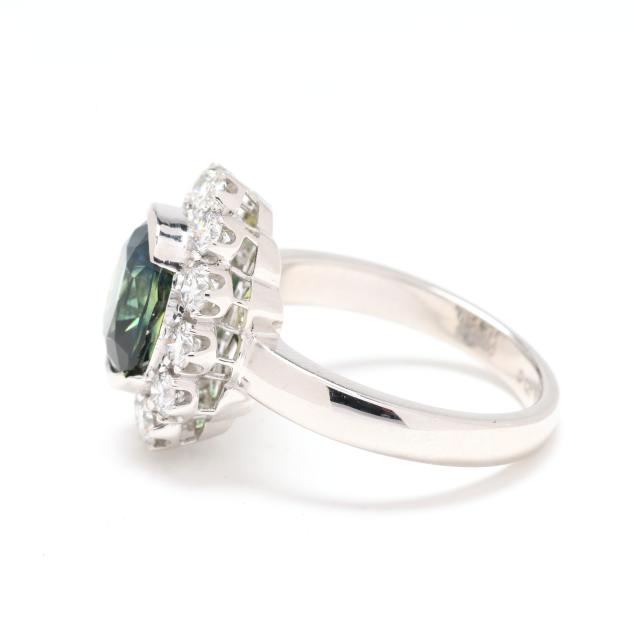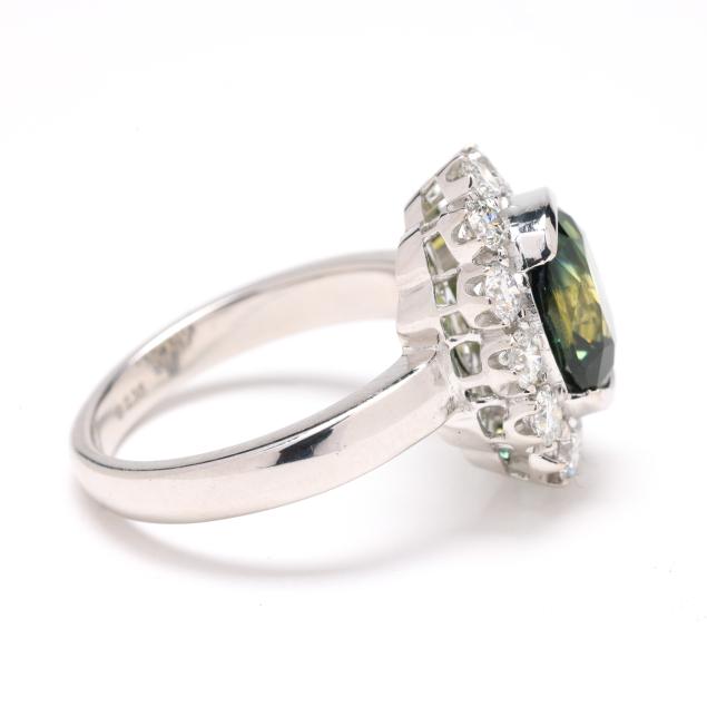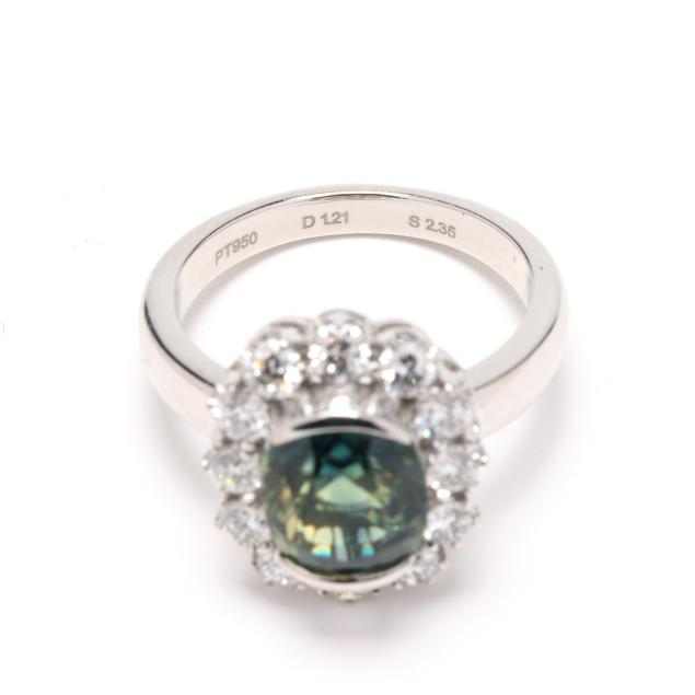 centered on a half bezel set antique cushion cut parti-color sapphire (9.83 x 8.41 x 6.31mm) weighing 4.34 carats (actual) within a halo of full cut round diamonds weighing 1.20 total carats (F-G color, VS1-VS2 clarity), marked PT950 D1.2 S2.35.