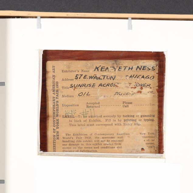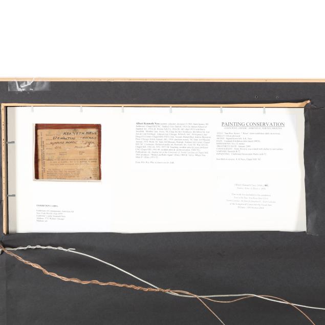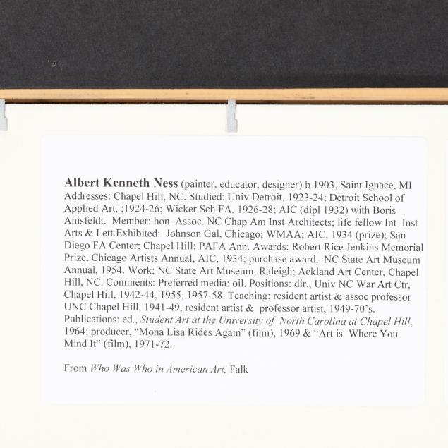 Born in Michigan, Kenneth Ness studied in Detroit and Chicago. The present painting was completed after finishing his studies at the School of the Art Institute of Chicago. By 1941 he was the Carnegie Resident Artist at UNC-Chapel Hill. Despite a military post during WWII, Ness remained in Chapel Hill, retiring from the university in 1973.