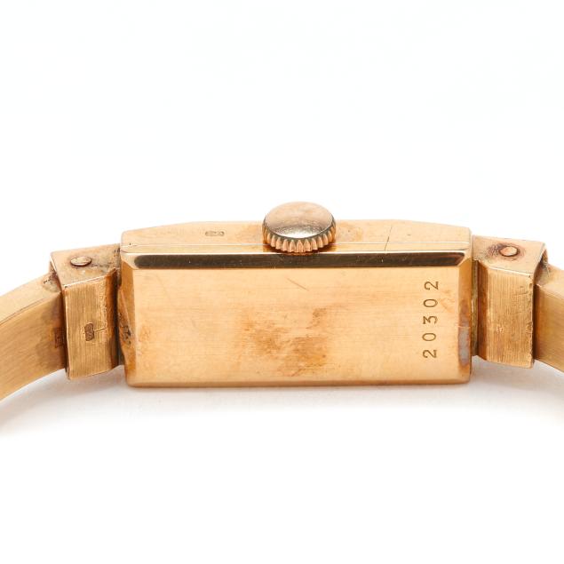Manual wind, reference number 20302, serial number 105194, the rectangular gold case with Swiss hallmarks for 18KT, the signed silver-tone dial with black Arabic numeral hour markers, and gold-tone sword hands, the hinged polished bangle bracelet stamped 0.750 / AB, completed with safety chain, the caseback exterior numbered 20302 and interior signed and numbered 105194 and with Swiss hallmarks for 18KT.