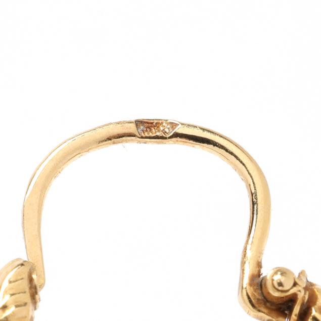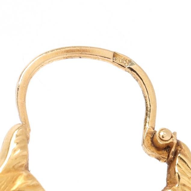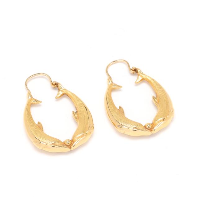 The gold hoop earrings in the design of two dolphins, completed with an ear wire, stamped 18K.