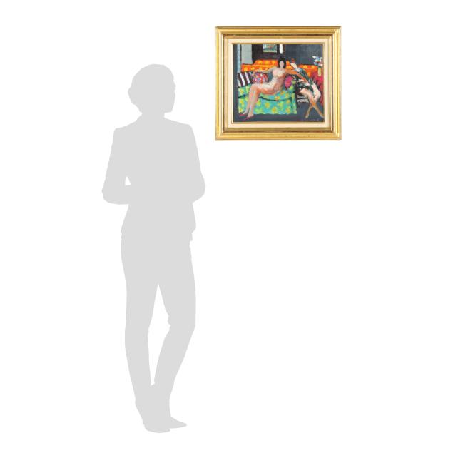 Oil on linen, signed at lower right, inscribed and dated 1966 on the verso, retains gallery label to the verso, presented in a gilt frame.