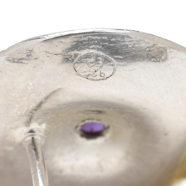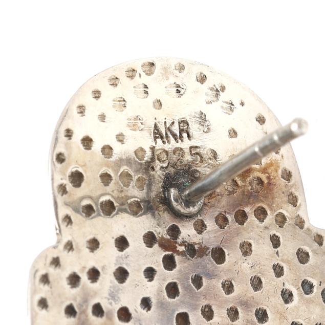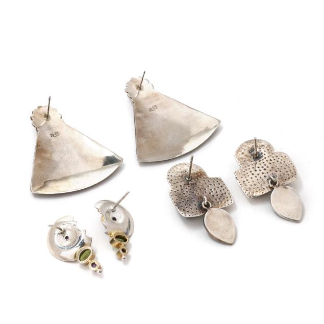 To include: a pair of silver earrings with beaded embellishments, bezel set with a round cabochon cut amethyst and suspending an oval cut peridot and a round cut amethyst, completed with a post, stamped 925 / EP (1 x .5 in.); a pair of silver earrings bezel set with oval cut quartz, square cut lapis lazuli, and a cushion cut beach glass, suspending a pear cut abalone tablet, completed with a post, signed AKR (Amy Kahn Russell) and stamped 925 (1.5 x 7/8 in.); and a pair of silver earrings bezel set with an oval cabochon cut amethyst, with geometric motif, completed with posts, stamped 925 (1 9/16 x 1 7/16 in.).