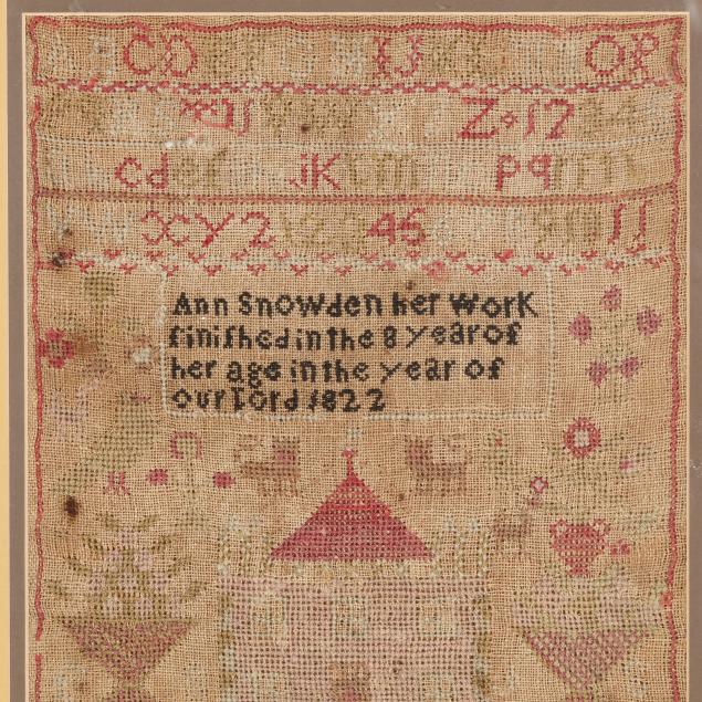 England, wool on linen, the upper alphanumeric registers worked in green and red cross stitch, separated by decorative borders, with large house and baskets of fruit and floral motifs below, with lions and avian figures, the center panel signed in dark brown, "Ann Snowden her work / finished in the 8 year of / her age in the year of / our Lord 1822," matted and framed in gilded frame under plexiglass.