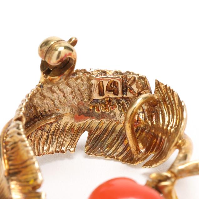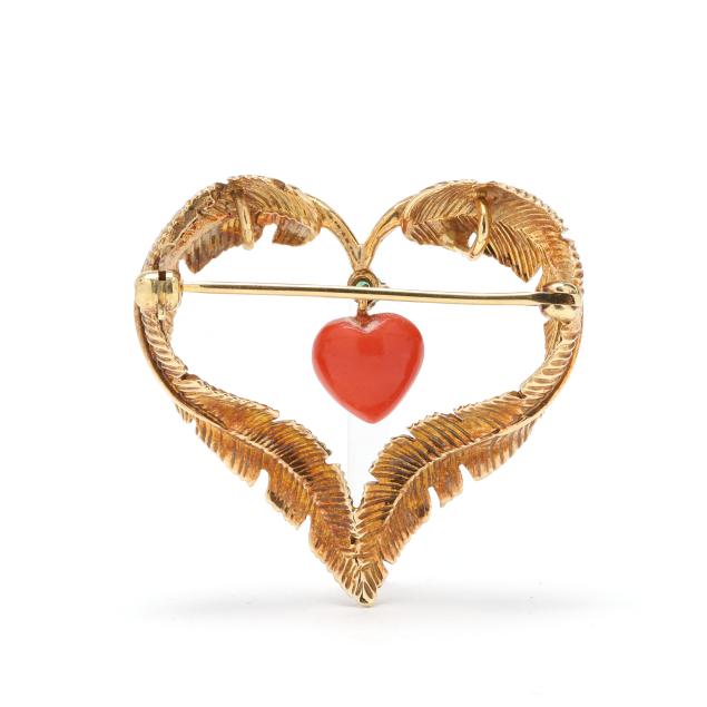 The gold heart brooch with feather motif set with a round cut emerald (2mm) and suspending a heart cut coral drop, completed with a locking pin stem and double bail, stamped 14K.