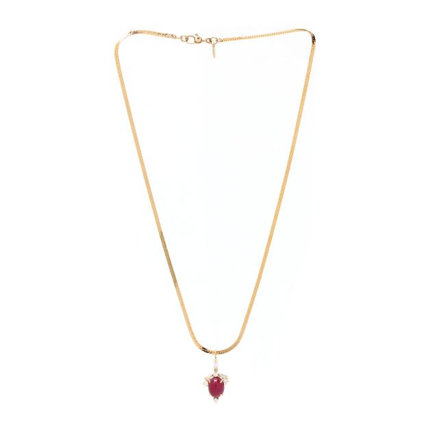 Gold, Ruby, and Diamond Pendant with Gold-Plated Herringbone Chain Necklace