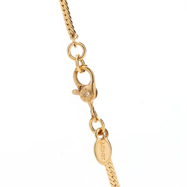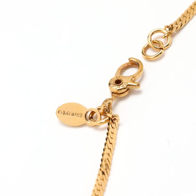 The gold pendant prong set with an oval cabochon cut ruby (9.5 x 7.6 x 4.7mm) and set with full cut round and baguette cut diamonds weighing approximately .43 total carat (H-I color, SI1-SI2 clarity), completed with a bail, and suspended from a gold-plated herringbone chain completed with a lobster clasp signed Monet and with a brand tag, pendant stamped 18KP and testing 18KT.