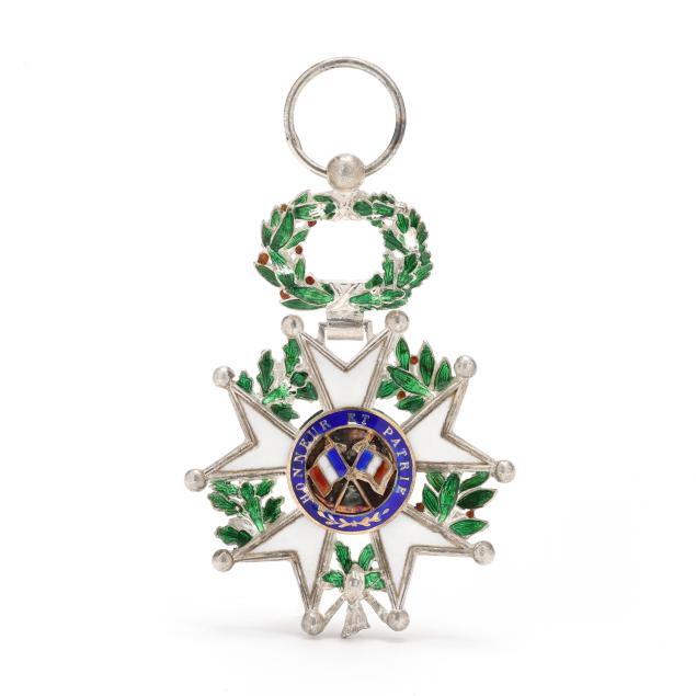 The replica Legion of Honor medal with green, orange, white, and blue enameling, testing silver.