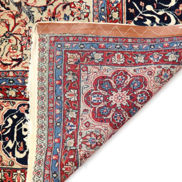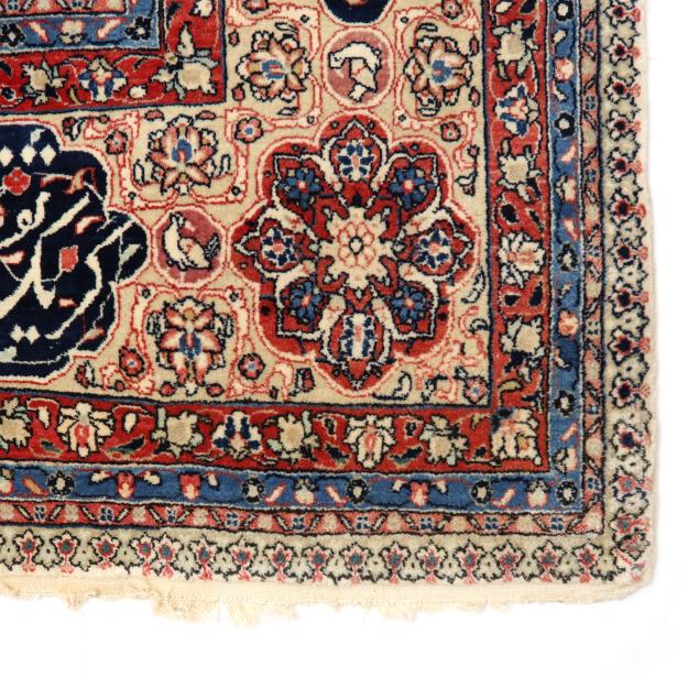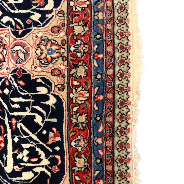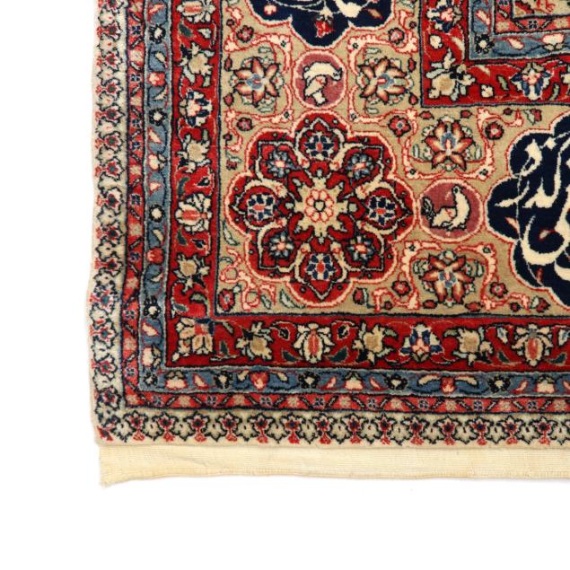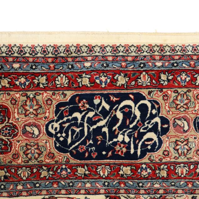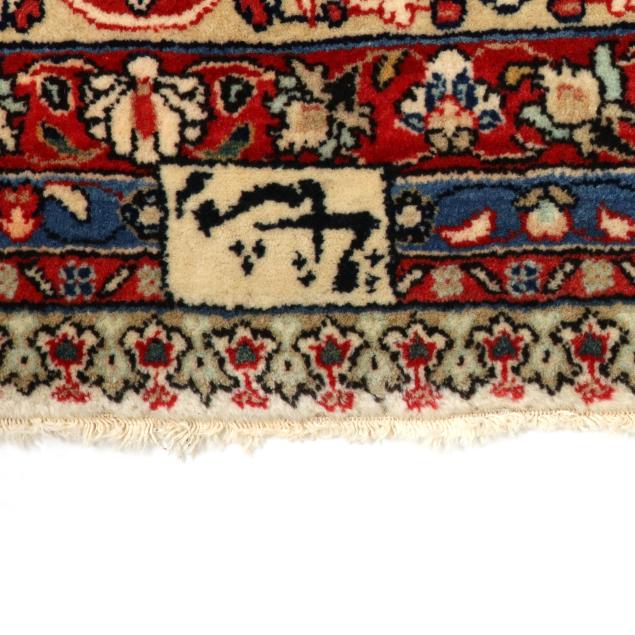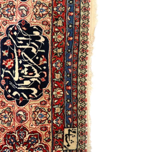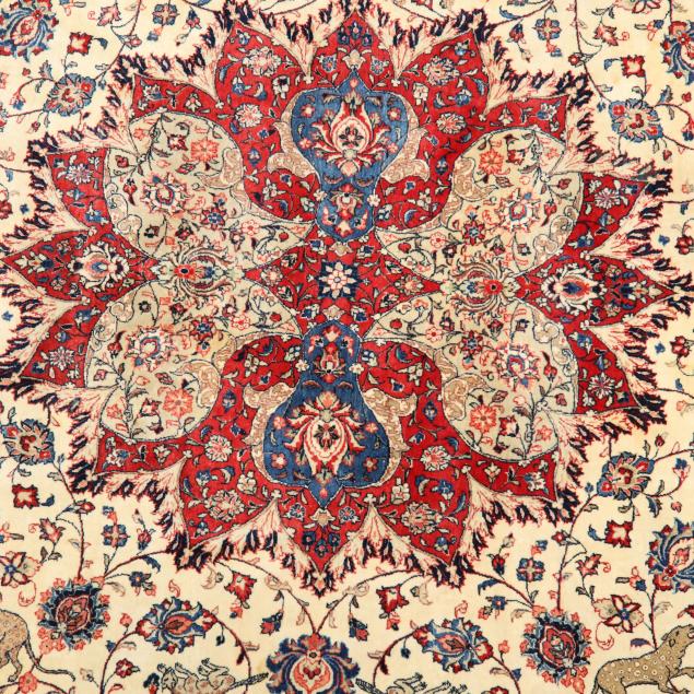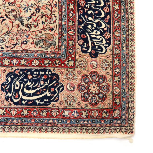 Wool on cotton foundation, finely and densely knotted, the central sunburst medallion in red and blue on a cream ground filled with vining floral and palmette motifs, with deer, lion, tiger, and dragon motifs, the taupe spandrels filled with floral and avian motifs, the wide main border with large-scale floral motifs alternating with navy blue cartouches featuring poetic script, within multiple minor floral borders, inscription in small cartouche to one end, with one fringe end and one end bound.