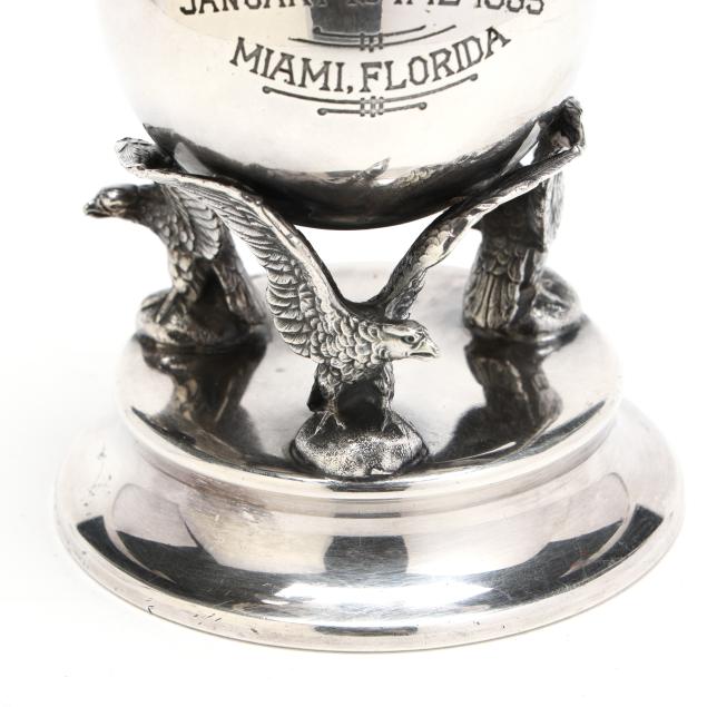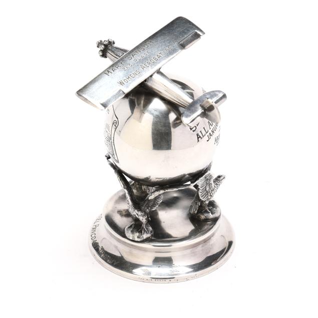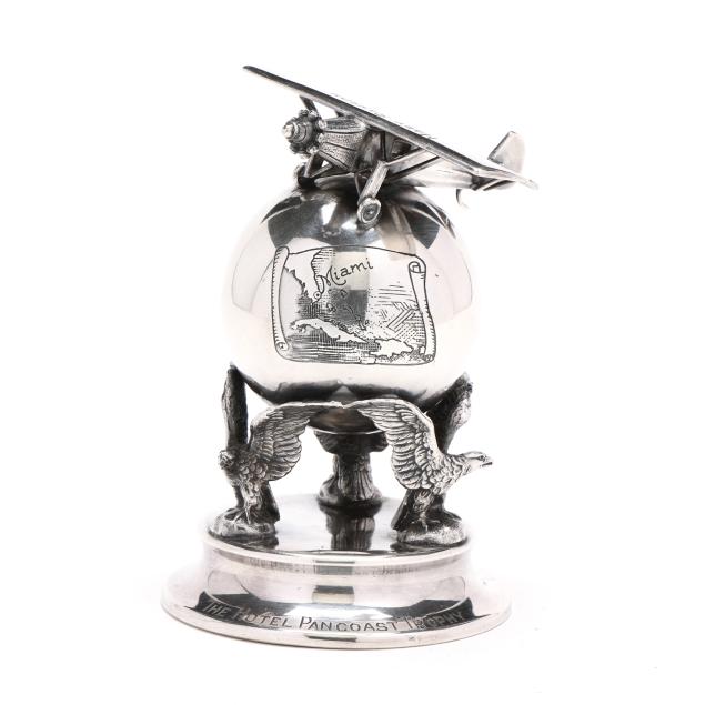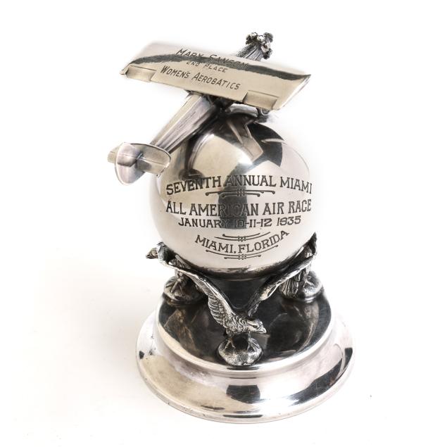 1935, small Hotel Pancoast trophy for the 7th Annual Miami All American Air Race, 2nd place for Mary Sansom, with International Silver Co silver-plate mark, EPWM, International Silver double plate mark, and "SD 6" to underside.