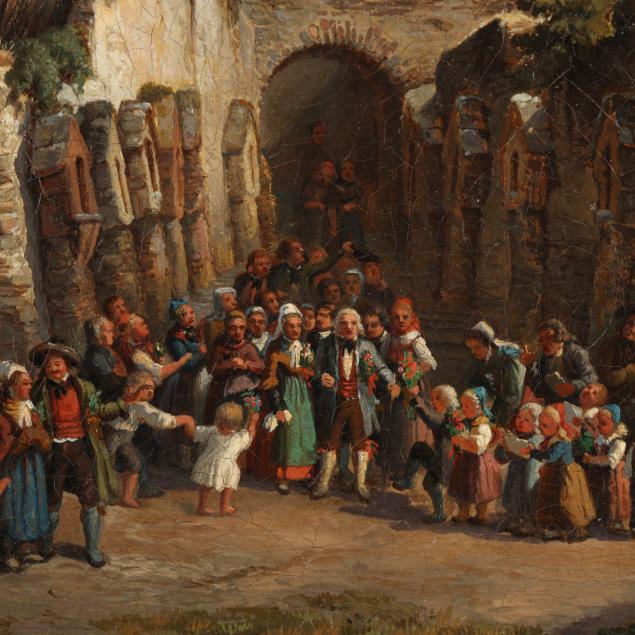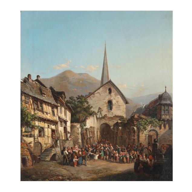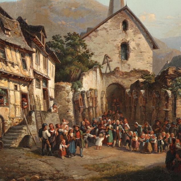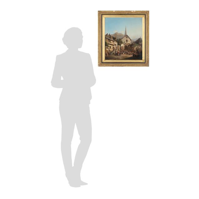 This painting, depicting a procession in an Alpine square, reflects a broader 19th-century European artistic movement that romanticized the medieval past and rural traditions, emerging in reaction to Enlightenment rationalism and the formality of Neoclassicism. In Germany, this was closely tied to the rise of cultural nationalism following the Napoleonic Wars and leading up to unification in 1871. Artists increasingly turned to historic towns, vernacular architecture, and Alpine landscapes enhanced by half-timbered buildings and townspeople as visual symbols of an authentic German identity rooted in regional history and folklore.