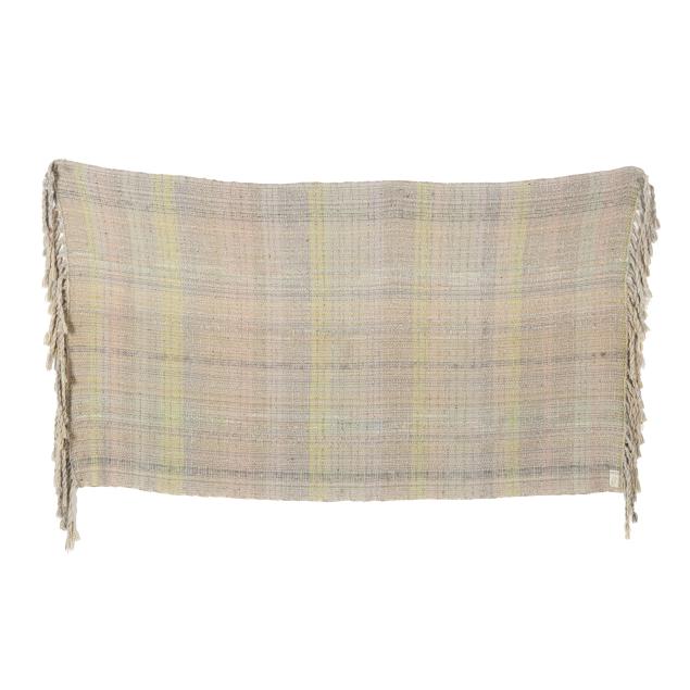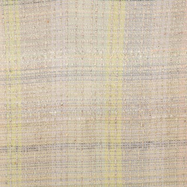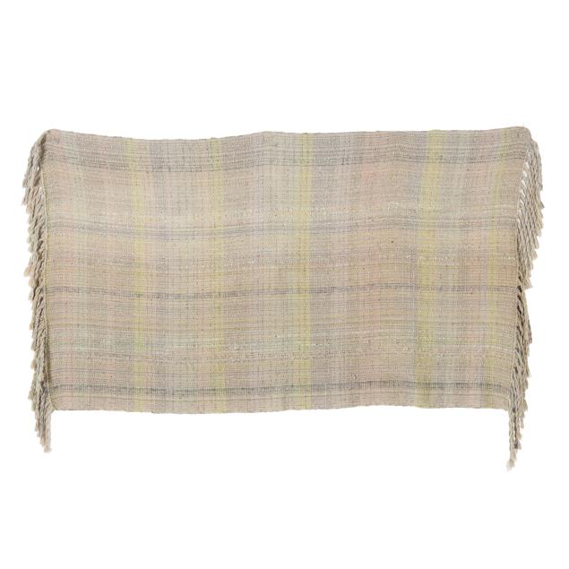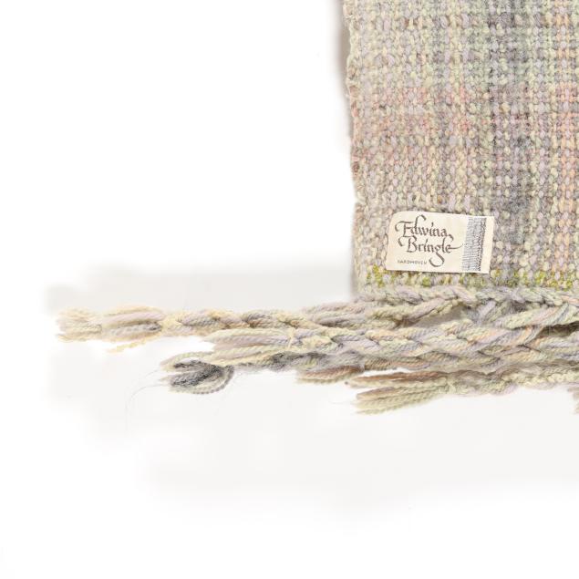 Woven wool yarn, late 20th century, the pastel green, lavender, and gray yarns woven into a long blanket with twisted fringe ends, with artist's label; together with USB drive of documentary "A Tale of Two Makers" about sisters Cynthia and Edwina Bringle and their art.