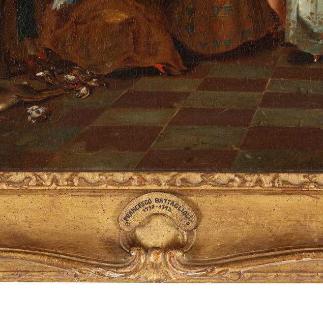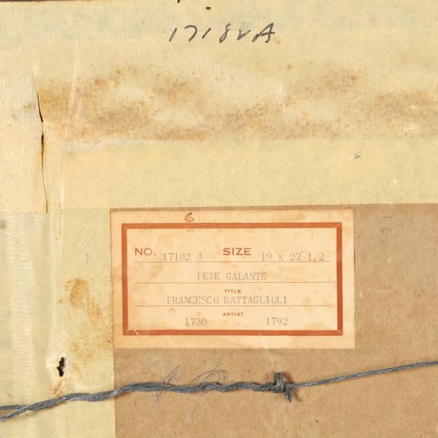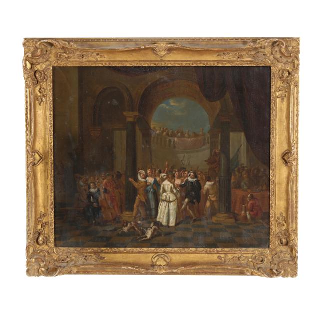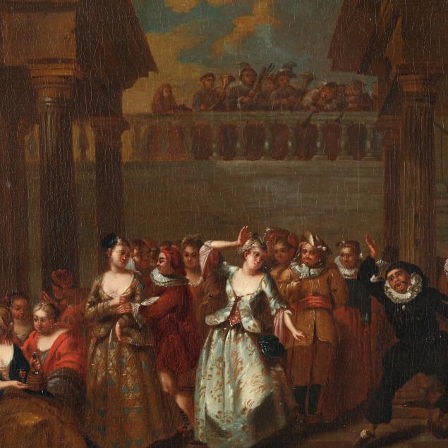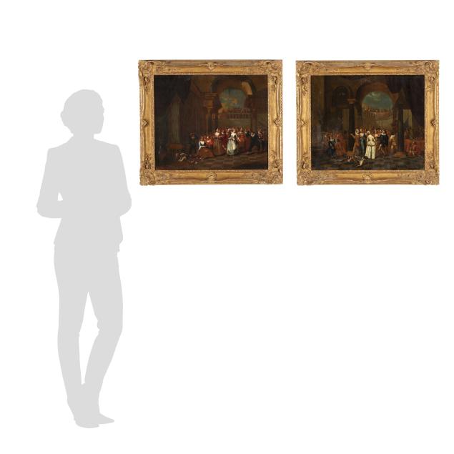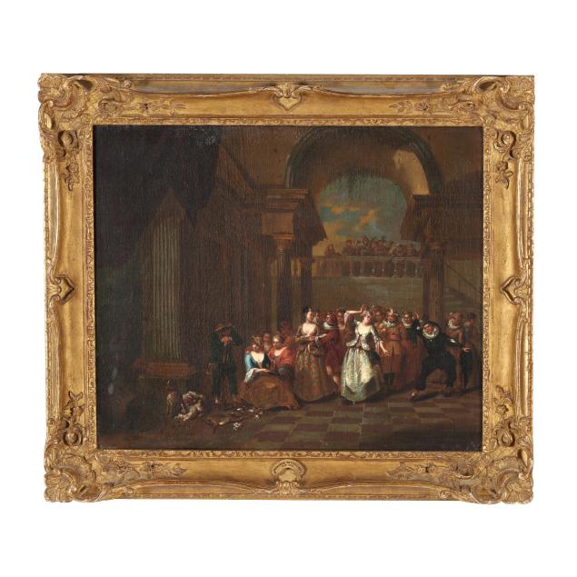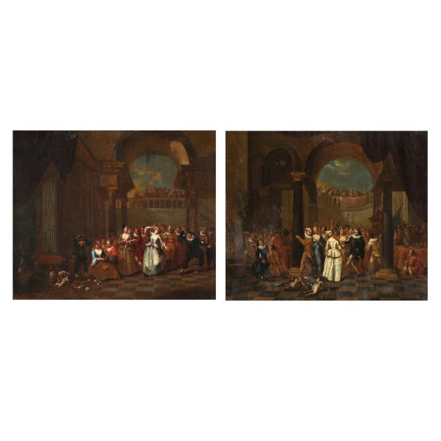 Private Collection from an Equestrian Farm, Moore County, North Carolina This scene, depicting an elegant celebration at court, represents an important transitional moment in European art history, marking the shift from the grandeur and religious intensity of the 17th-century Baroque tradition toward the lighter, more decorative tastes of the Rococo. The pair conveys strong influence from French Rococo painting, particularly the genre of the fête galante popularized by Watteau, which focused on aristocratic leisure and courtly entertainment, often set within theatrical architectural surroundings.