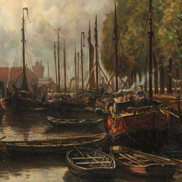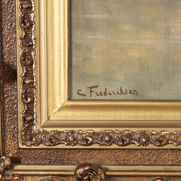 Private Collection from an Equestrian Farm, Moore County, North Carolina Carl Frederiksen was a Danish painter known for atmospheric landscapes and naturalistic coastal scenes of Scandinavia. He depicted quiet rural views, harbors, and shoreline settings with controlled brushwork and a restrained palette, emphasizing light and seasonal mood. Frederiksen died in 1932 at the age of forty, leaving behind a scarce body of work.