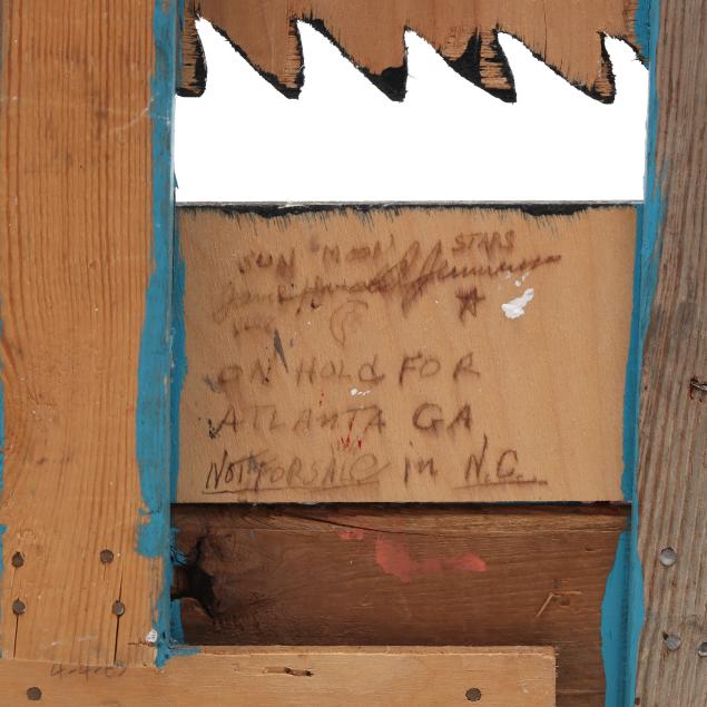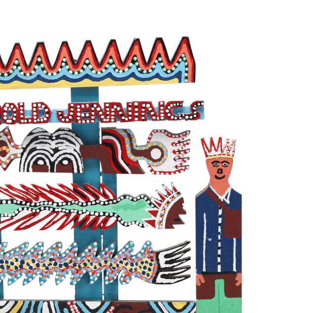 Jennings' work is noticeable for its colorful and sometimes complex, painted dots as well as astral forms. One series of pieces featured women beating up men and was apparently inspired by reading about Celtic and Amazon women. When inspiration failed, Jennings resorted to a favorite trick of pressing fingertips against closed eyelids. Calling himself the “sun, moon and star artist,” he frequently incorporated these symbols within his work as well as included them with his signature.