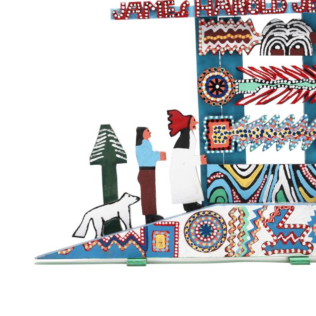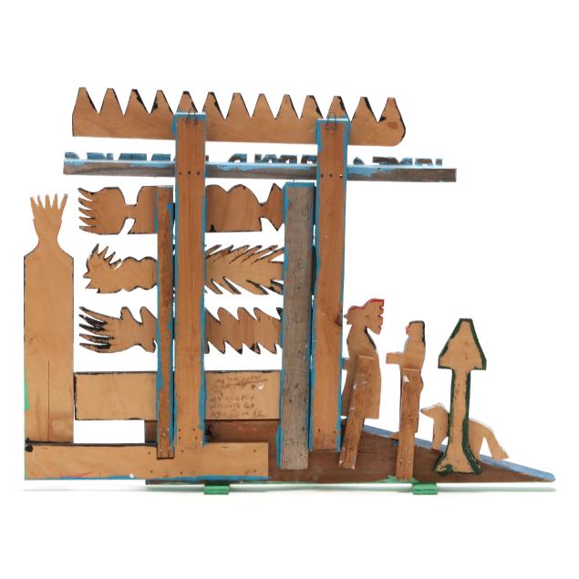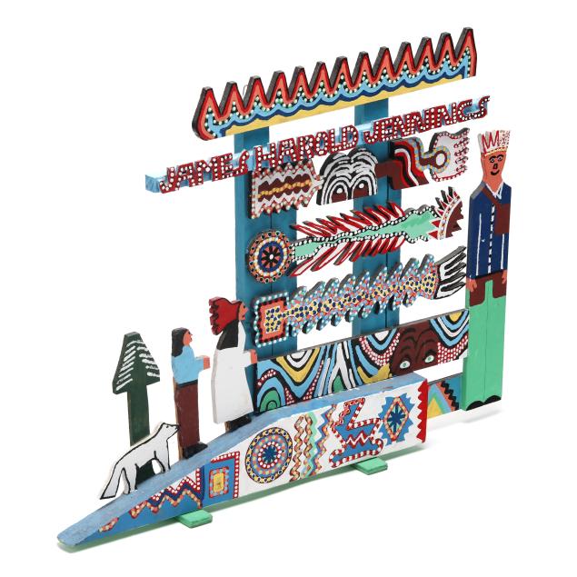 Late 20th century, painted carved and assembled wood, with Native American figures and the artist's name towards top, signed to verso.