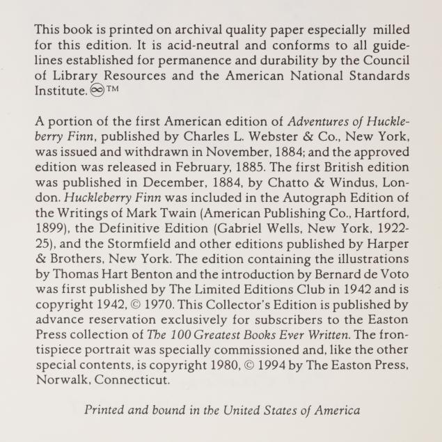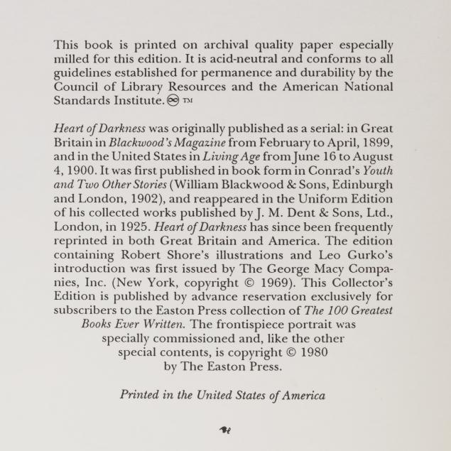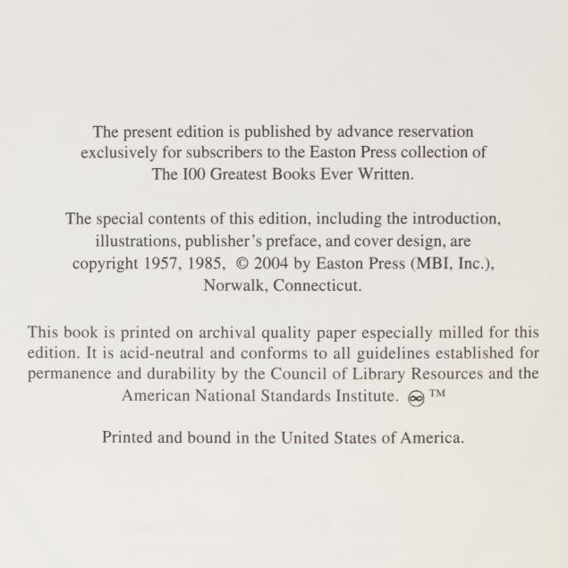 Norwalk, CT: The Easton Press, [1975-2004]. Collector's Editions; (54) titles, all from "The 100 Greatest Books Ever Written" series; all 8vo or 4to, finely bound in gilt-decorated full genuine leather with moire endpapers, satin ribbon bookmark, and all edges gilt. Includes titles such as: Leo Tolstoy's