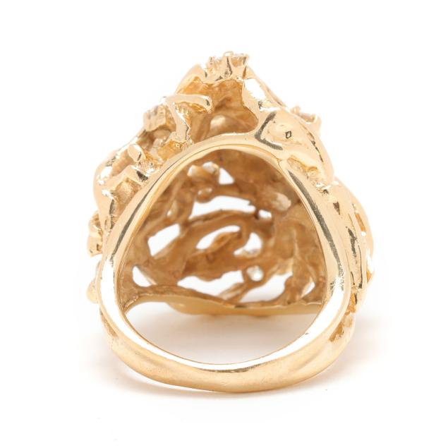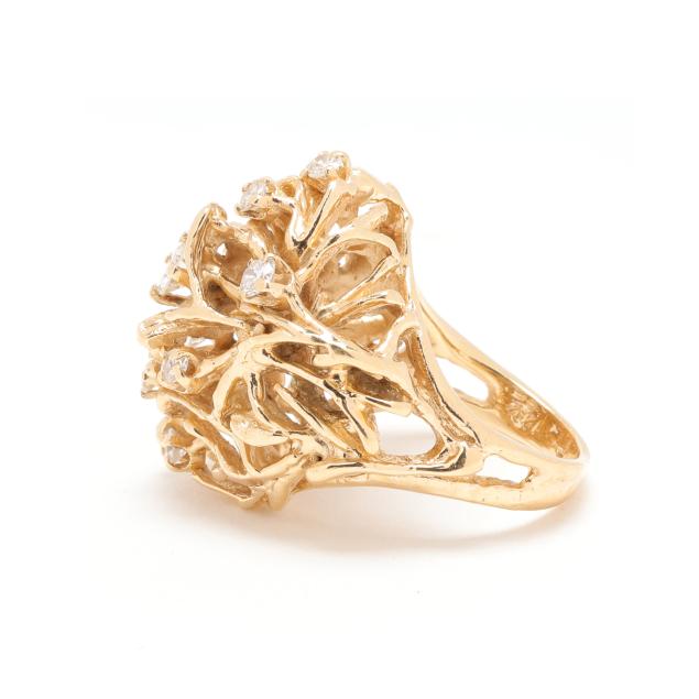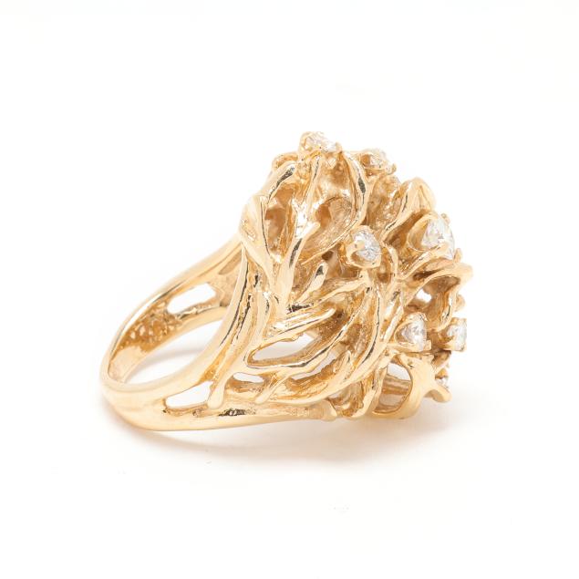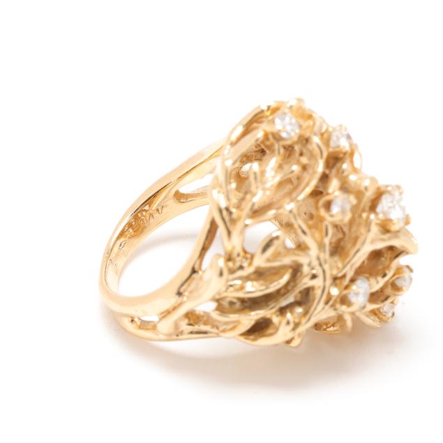 The domed ring in a twig motif and prong set with interspersed full cut round diamonds weighing approximately .70 total carat (H-I color, SI1-SI2 clarity), stamped 14K.