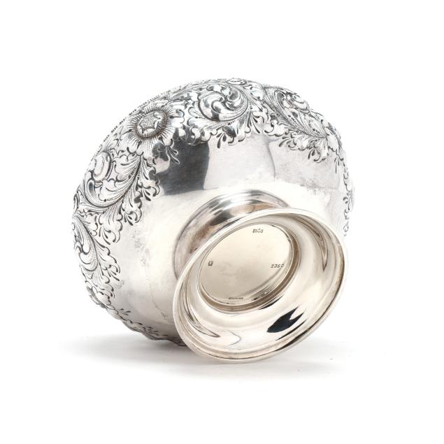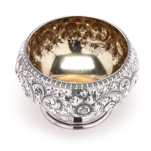 Date mark of 1891, pattern number 2350, featuring a gold wash interior, hand-chased floral motifs, egg and dart rim, and pedestal foot, not monogrammed.