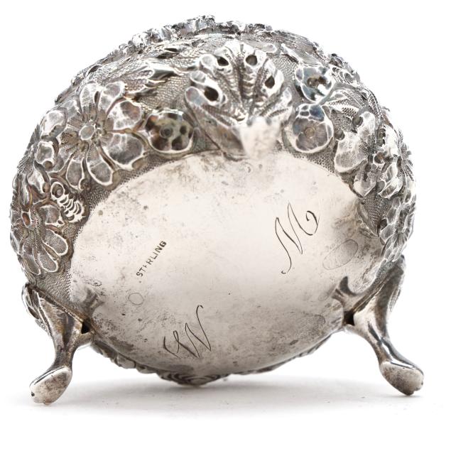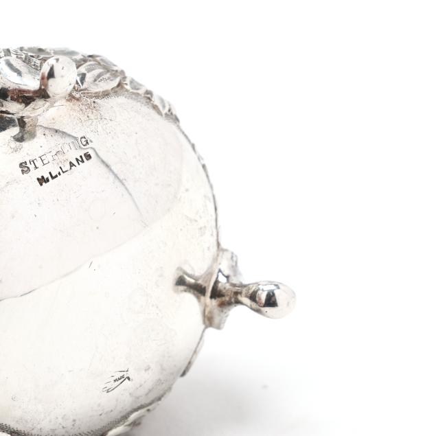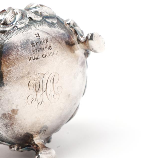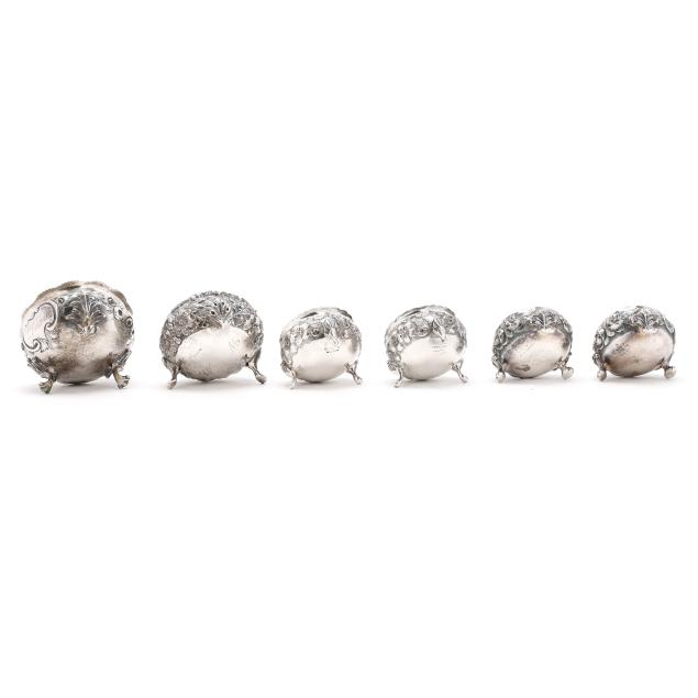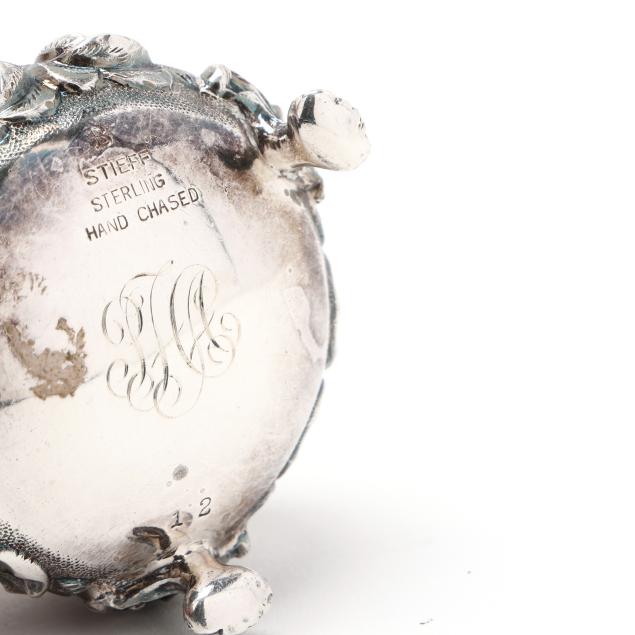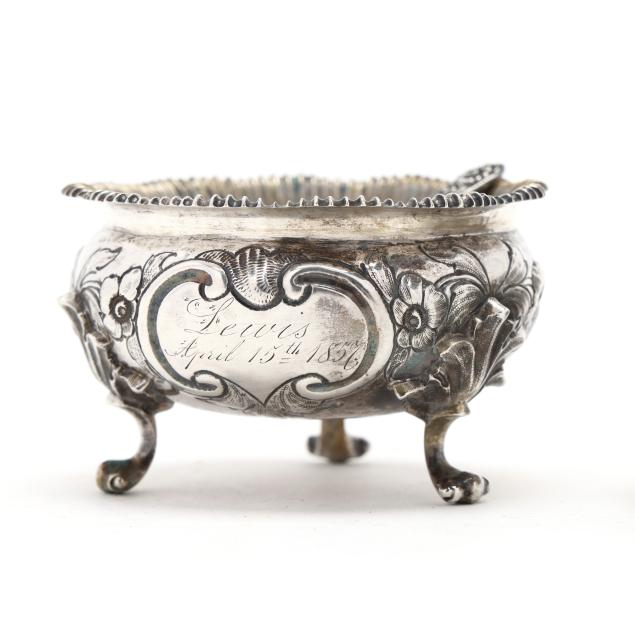 Includes an antique Gorham coin silver cellar; a repousse cellar marked "Sterling" and monogrammed "W M" to the underside, engraved "Lewis / April 15th, 1857"; a pair of sterling cellars by A. G. Schultz Co., retailed mark of H. L. Lang, Staunton, Virginia; and a pair of Stieff sterling cellars, pattern number 12, script monograms to the undersides; with (6) assorted sterling salt spoons.