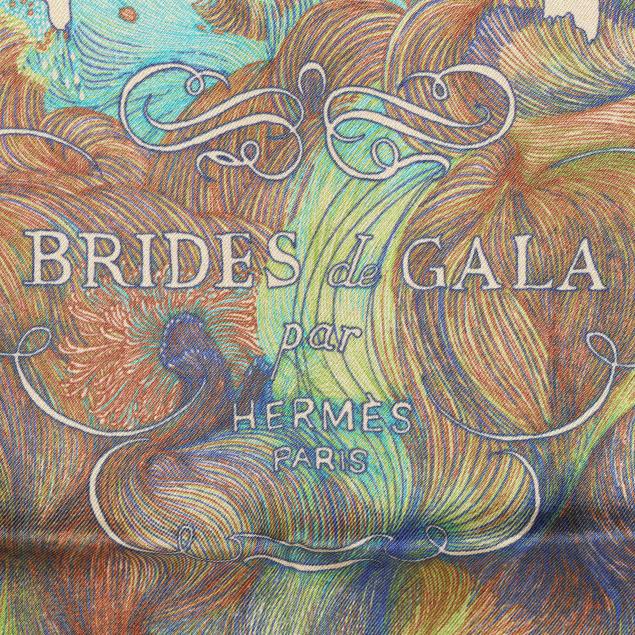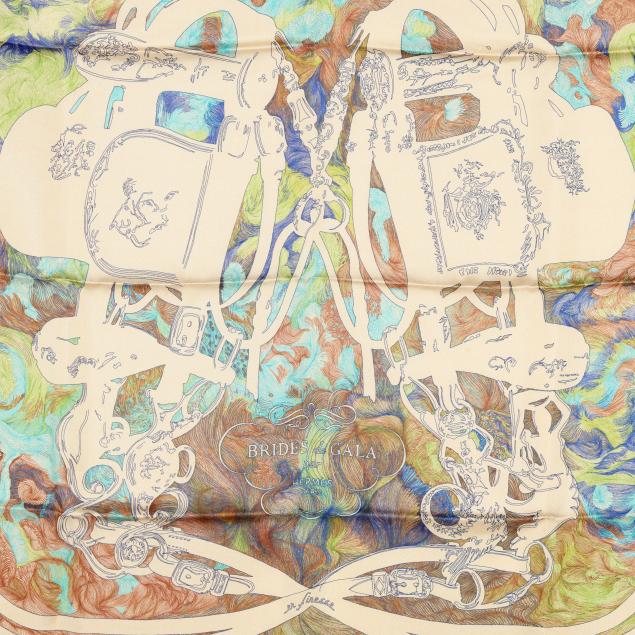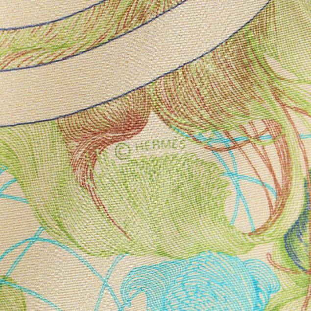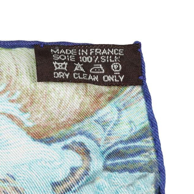 Designed by artist Hugo Grygkar, the silk twill with rolled and hand stitched edges, with a color palette of blue, green, and red, and with care tag stating made in France.