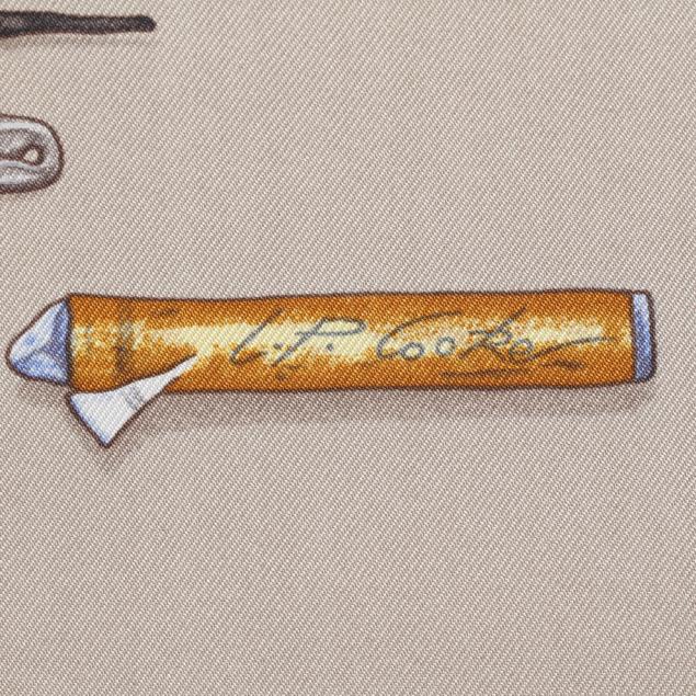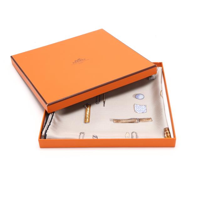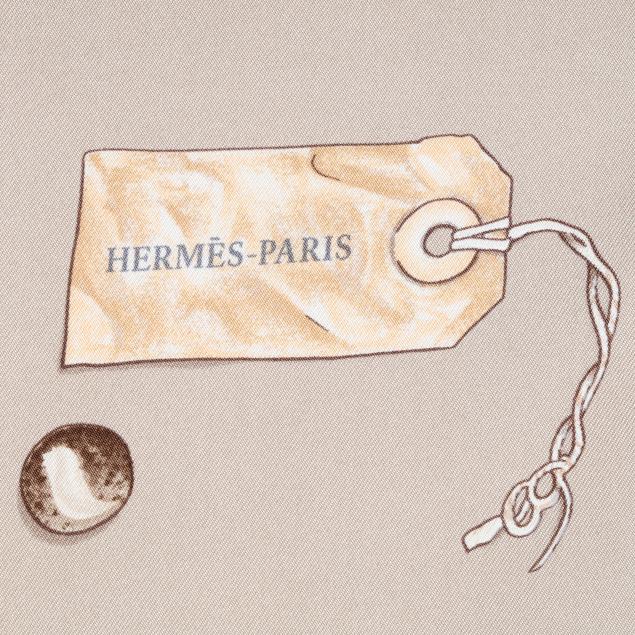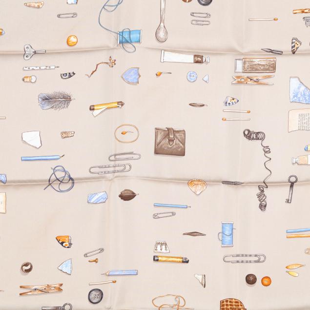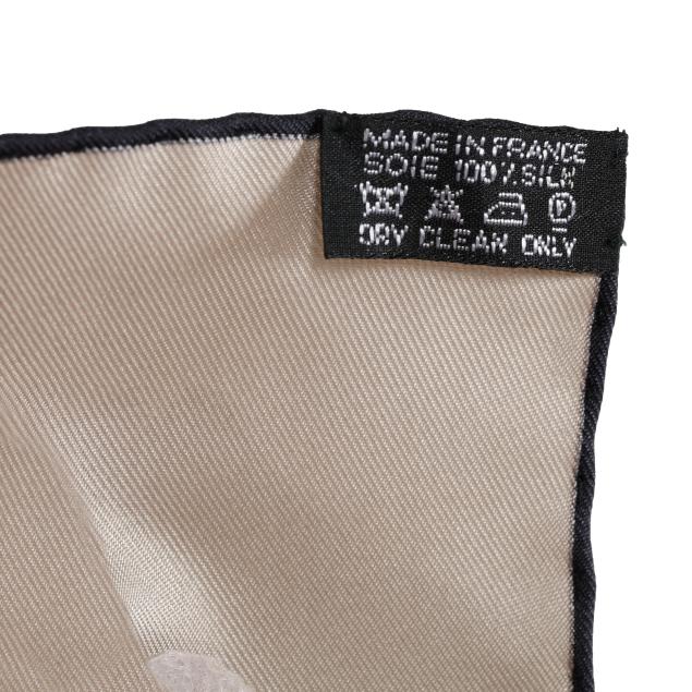 Designed by artist Leigh Cooke, the silk twill with rolled and hand stitched edges, with a color palette of black, gray, and beige, and with care tag stating made in France.