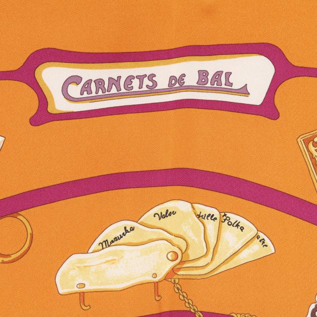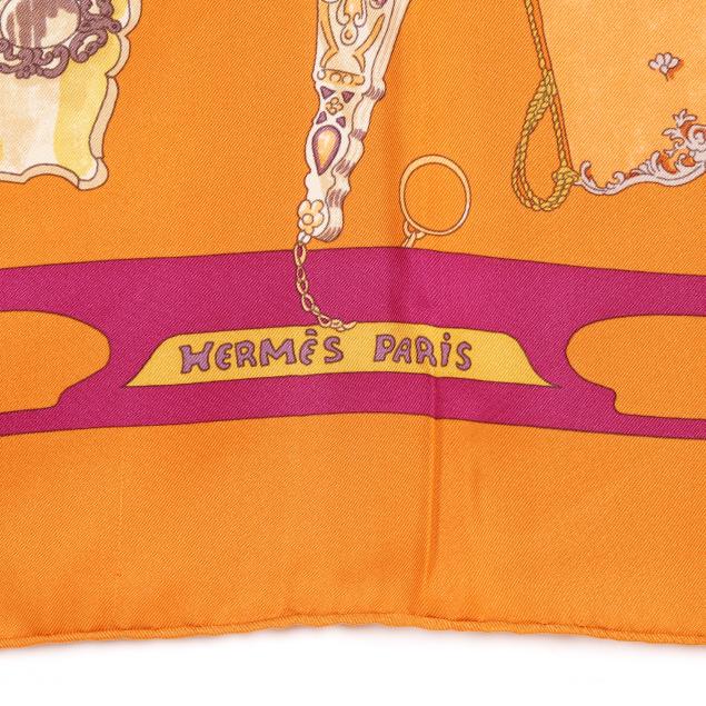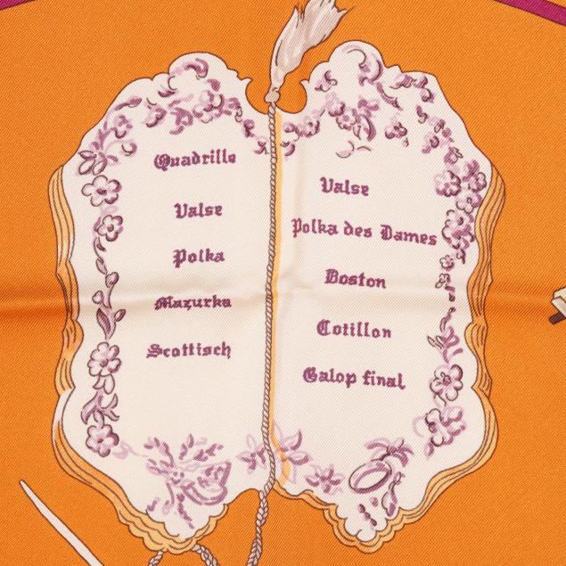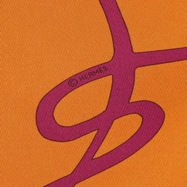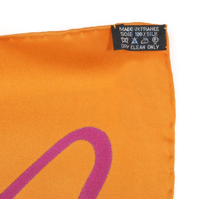 Designed by artist Caty Latham, the silk twill with rolled and hand stitched edges, with a color palette of orange and purple, and with care tag stating made in France.