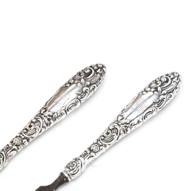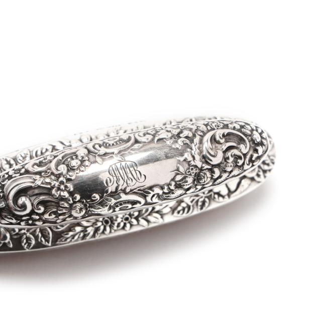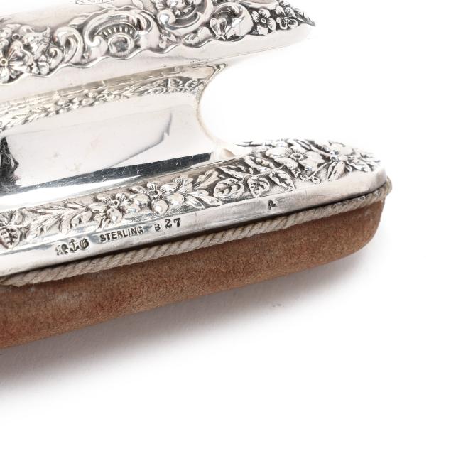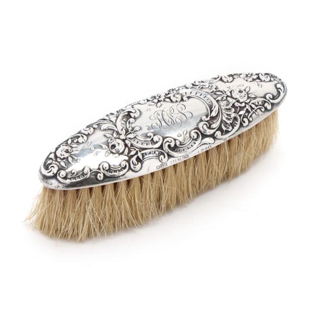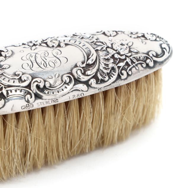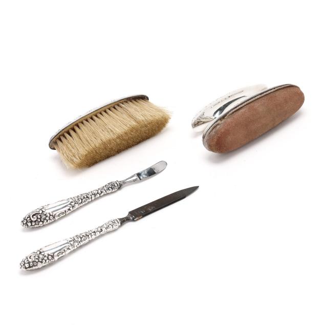 Includes a nail buffer, pattern number B27, a small clothes or dusting brush, pattern number 1280, a cuticle tool, and a file, all with script monograms.