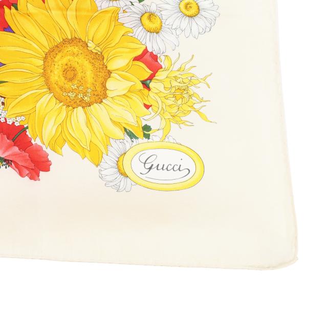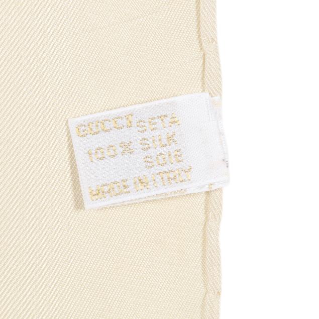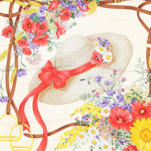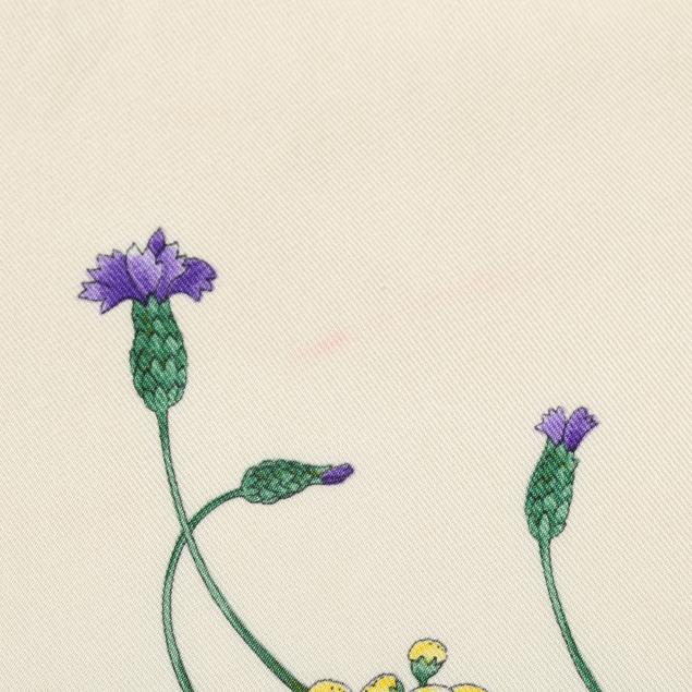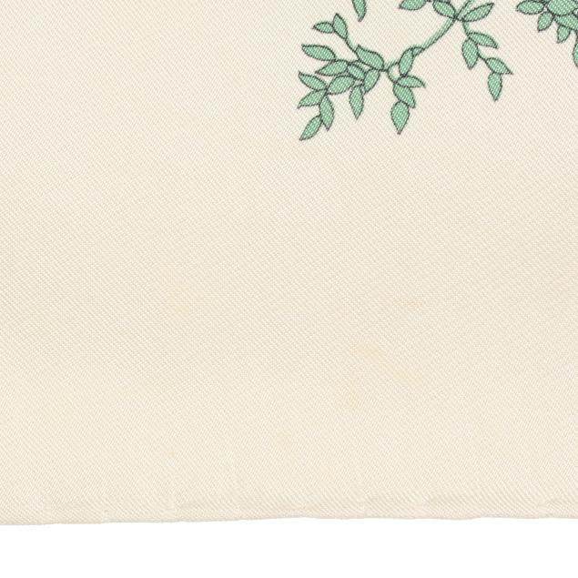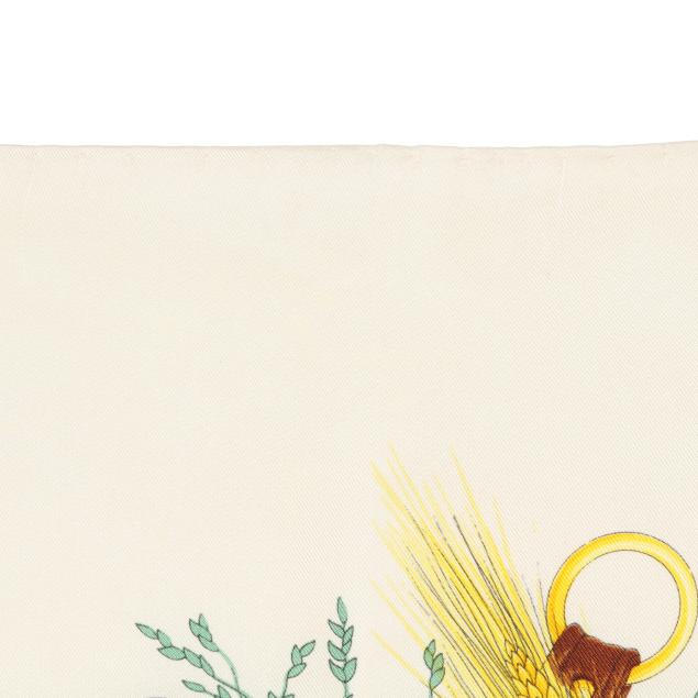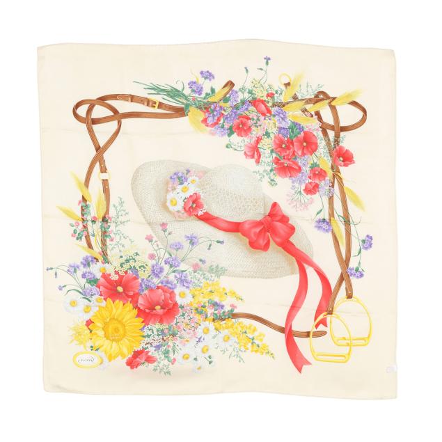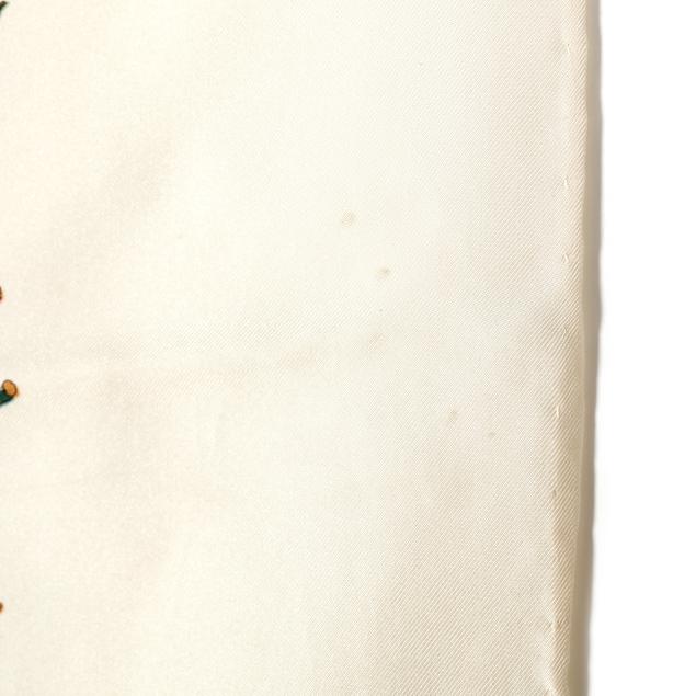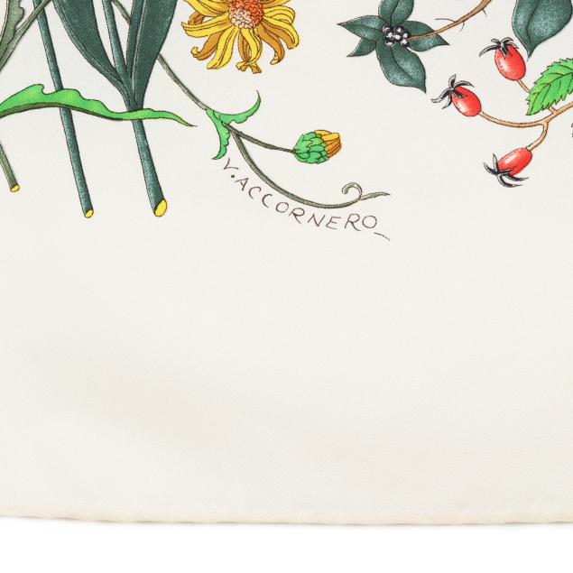To include: one designed by artist Vittorio Accornero de Testa, the silk twill with a multi-color color palette on a white background (34.75 x 33.5 in.) (some scattered soiling and spots; sweet scent present; otherwise, good estate condition); and one in silk twill with a multi-color color palette on a white background, and with a care tag stating made in Italy (33.5 x 34.5 in.) (soiling throughout; some runs to edges; sweet scent present).