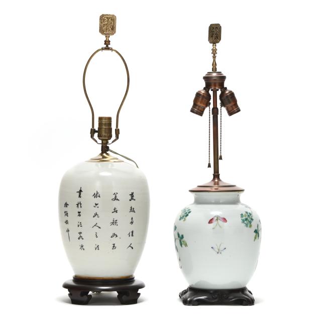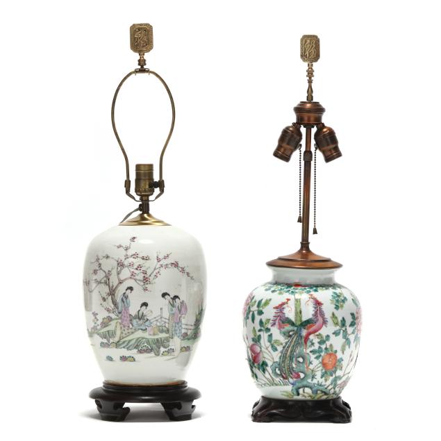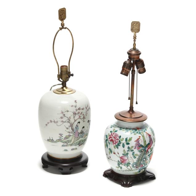 Late 19th and early 20th century, the larger a ginger jar hand painted in famille rose palette with elegant ladies at leisure in a lush garden to one side, the reverse side with calligraphy in black ink (jar size 11 in.); the smaller, a jar hand painted in famille verte palette with twin phoenix surrounded by large peony and floral blooms (jar size 9 in.), both presented drilled and set into carved wood bases, topped with finials displaying the Chinese character for luck, presented together with fabric lampshades.