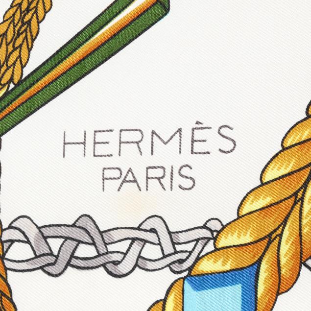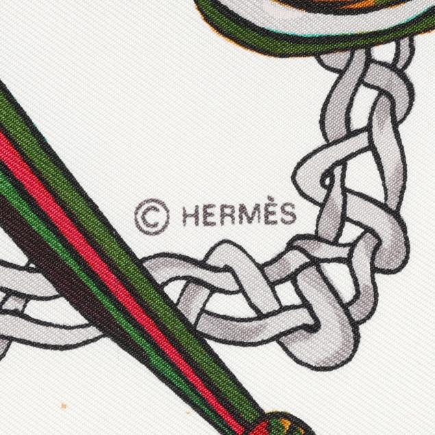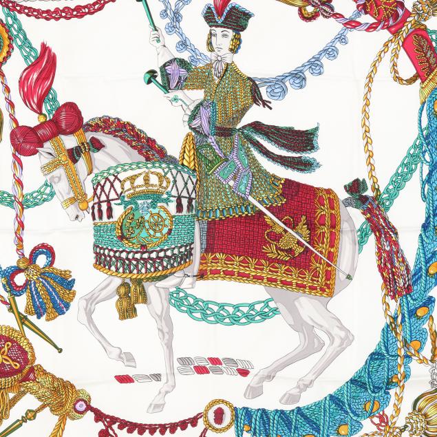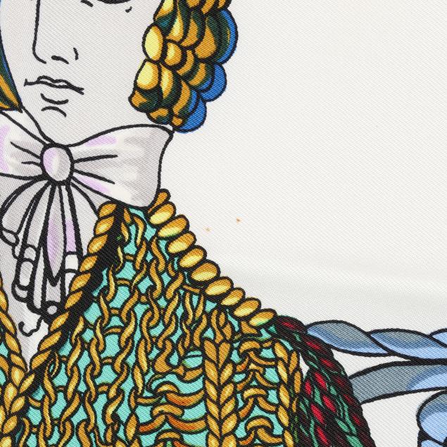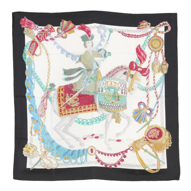 Designed by artist Marie-Françoise Héron, the silk twill with rolled and hand stitched edges, with a color palette of black, white, and multi-color.