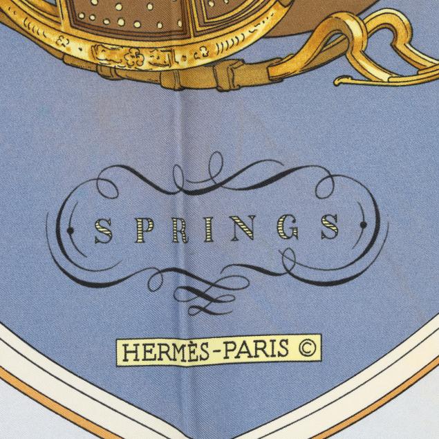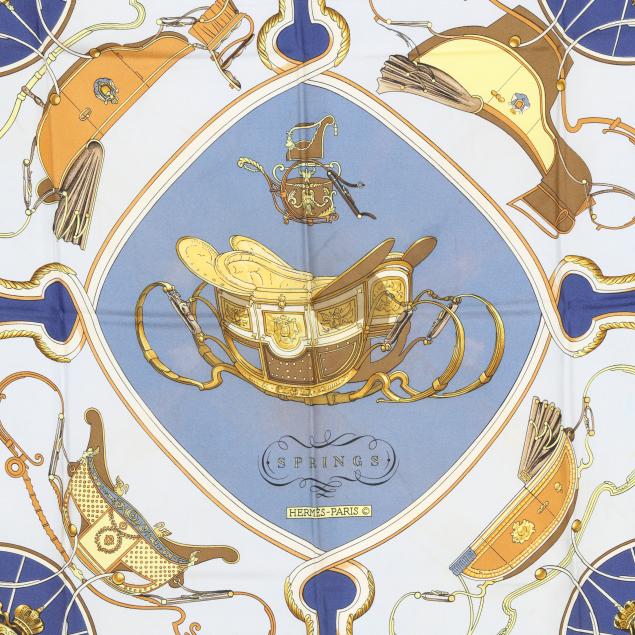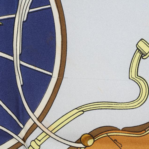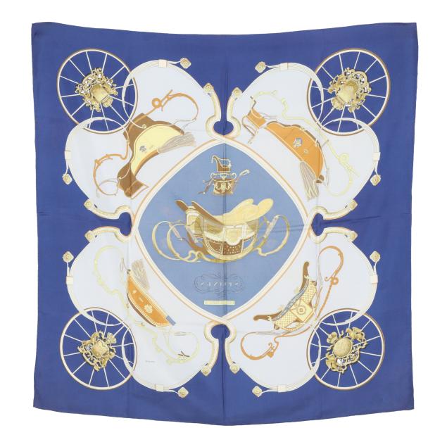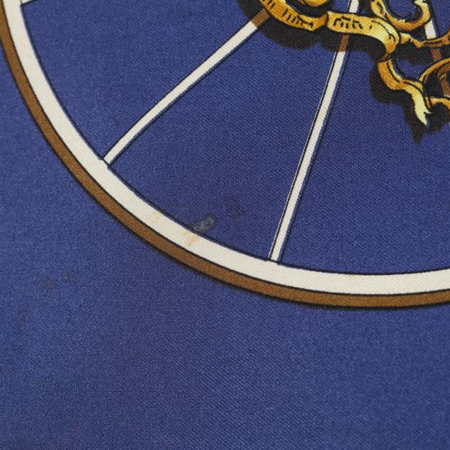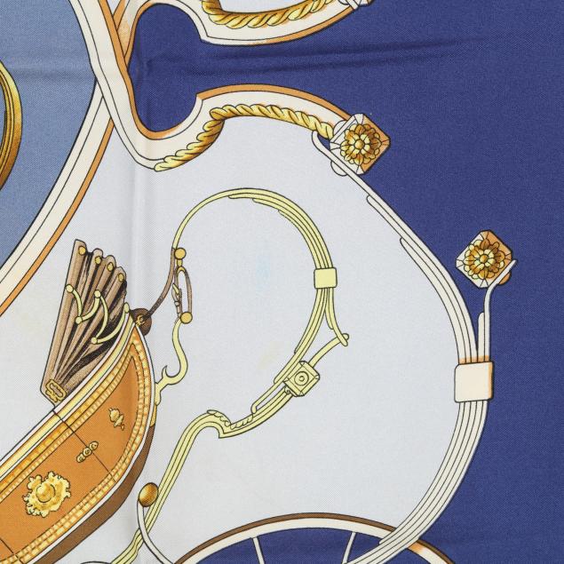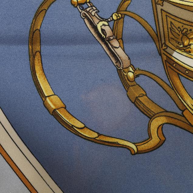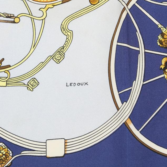 Designed by artist Philippe Ledoux, the silk twill with rolled and hand stitched edges, with a color palette of blue, gray, and gold.