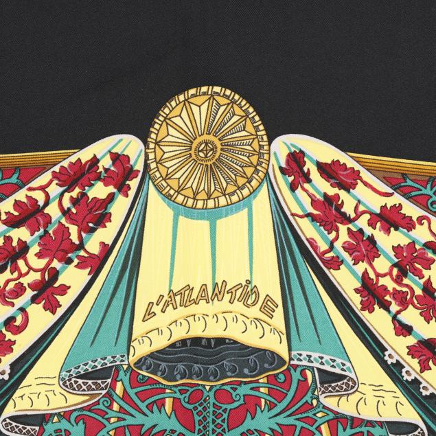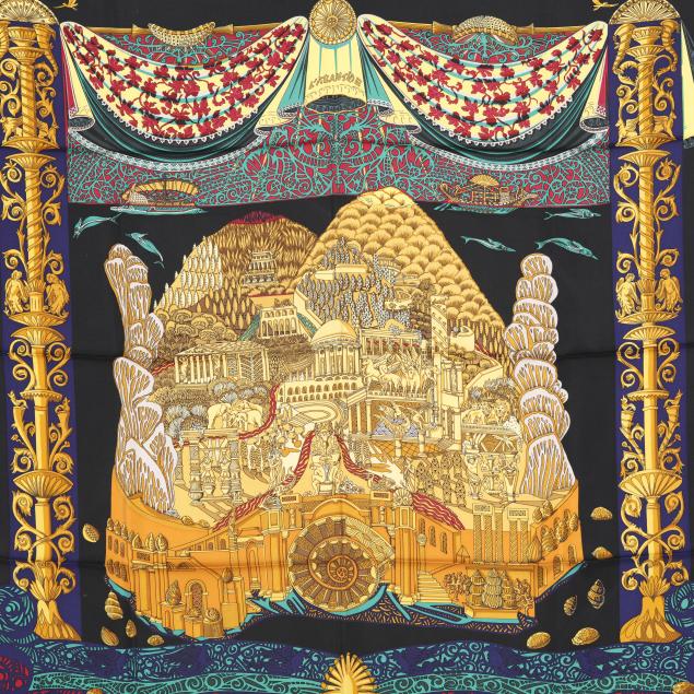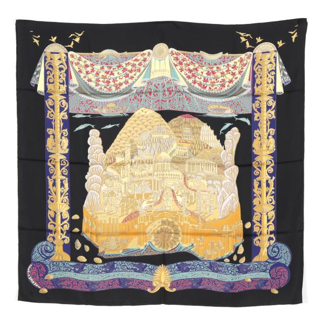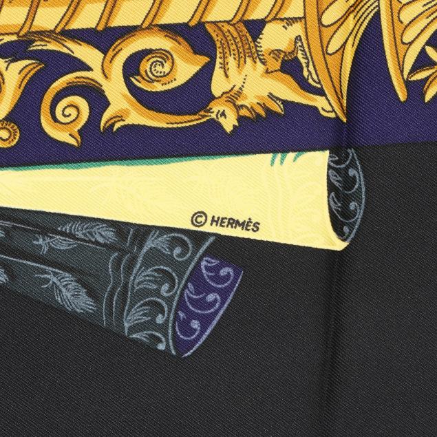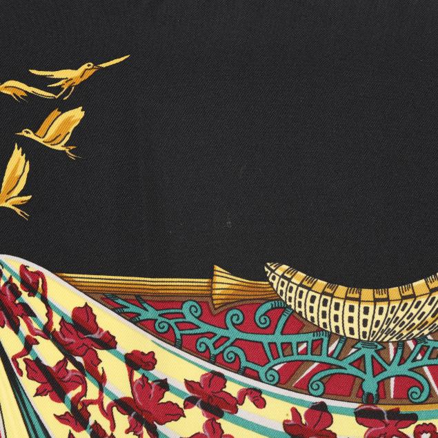 Designed by artist Annie Faivre, the silk twill with rolled and hand stitched edges, with a color palette of black, gold, and navy.