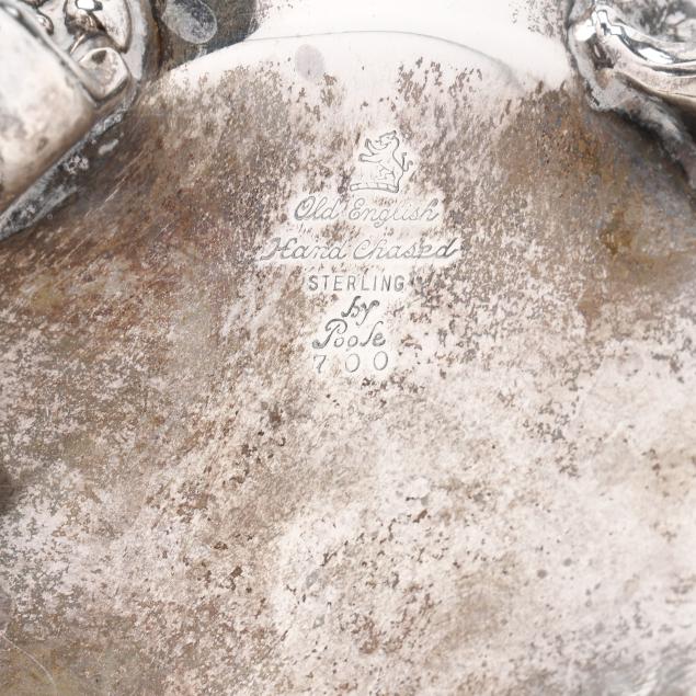 Pattern number 700, featuring hand-chased repousse cartouches to each side, raised on four foliate feet, not monogrammed.