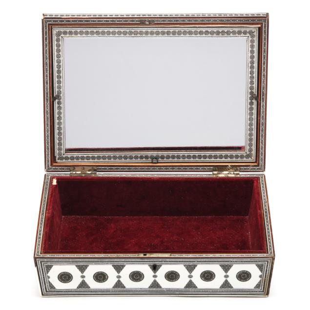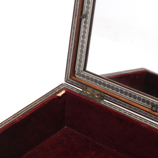 19th century, chamfered rectangular form box decorated with micro-mosaic inlay (sadeli) consisting of bone, wood, and metal, hinged lid opens to maroon velvet lined interior with hinged mirror to lid, no key present.