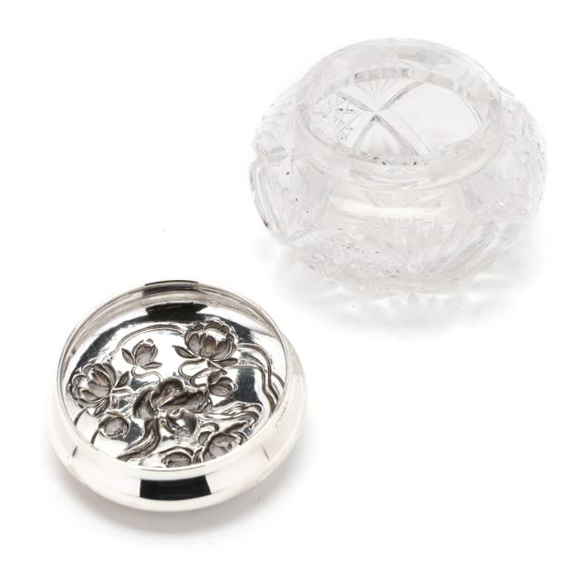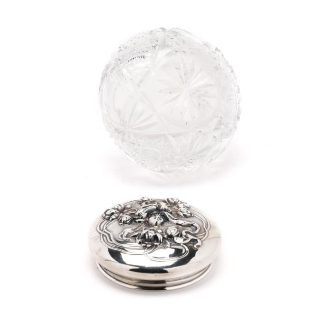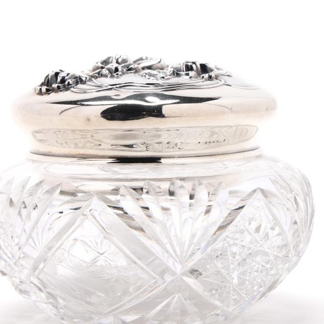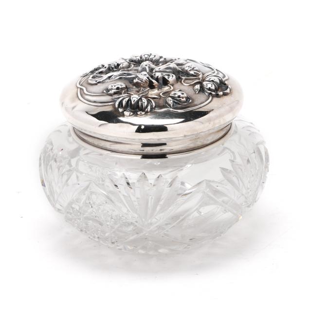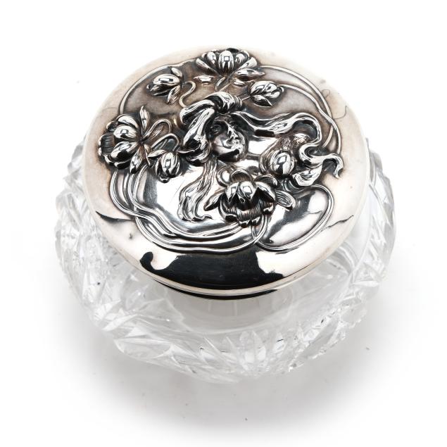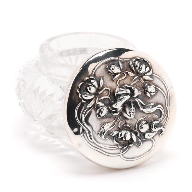 Rubbed hallmarks, American, circa early 20th century, featuring a woman's face with stylized hair transforming into floral motifs, over a crystal jar, not monogrammed.