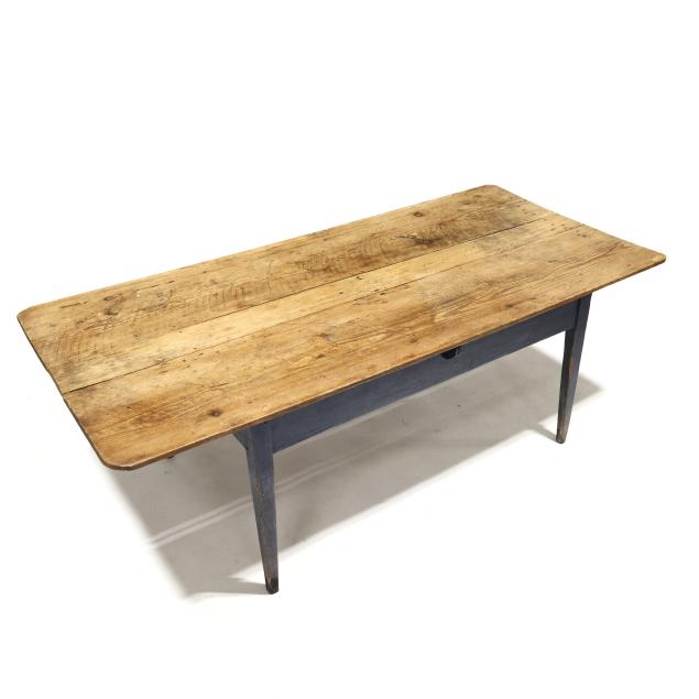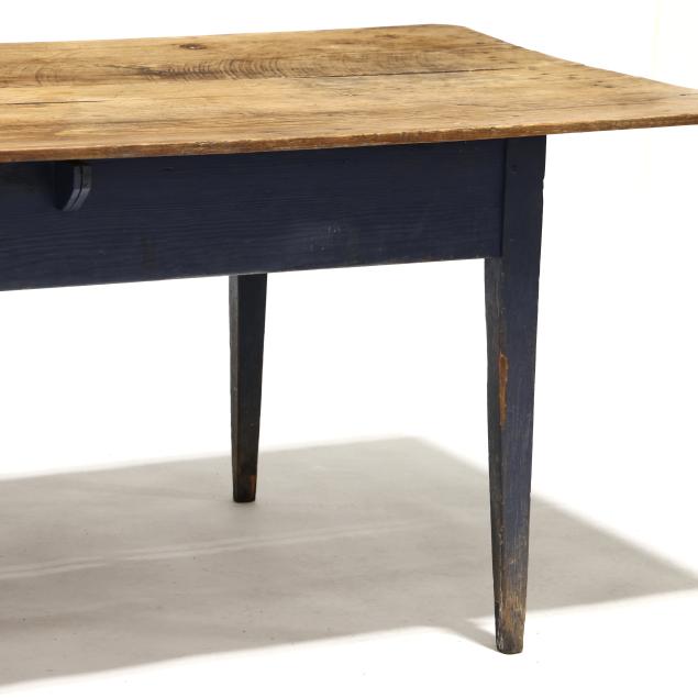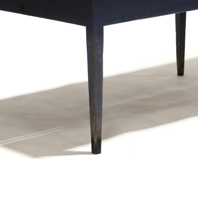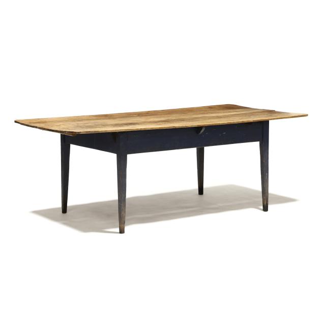 19th century, three board top mounted to a blue painted pegged construction base with square tapered legs.