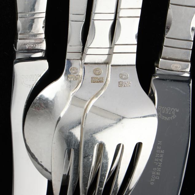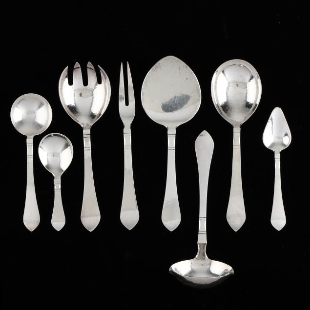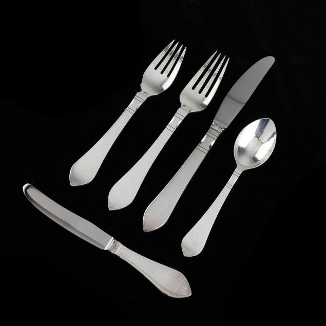 (89) pieces to include: (12) dinner knives (8 3/4 in.); (11) dinner forks (7 1/4 in.); (12) salad forks (6 7/8 in.); (20) teaspoons (5 3/4 in.); (12) round bowl soup spoons; (11) butter spreaders (4) fruit spoons; (2) serving spoons; a salad serving fork; a cold meat fork; a gravy ladle; a pastry server; and a bon bon spoon.