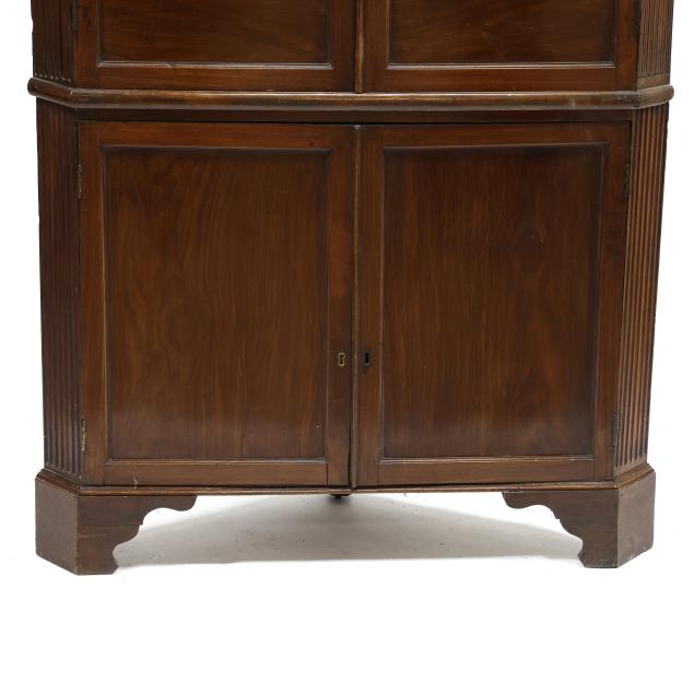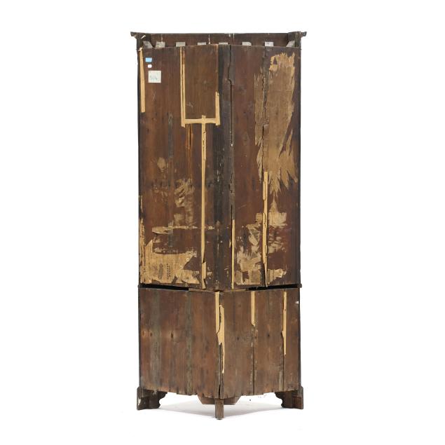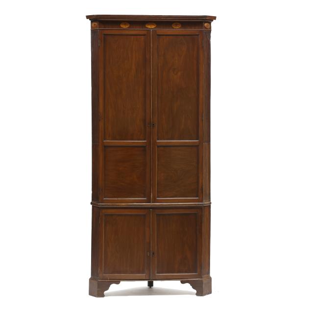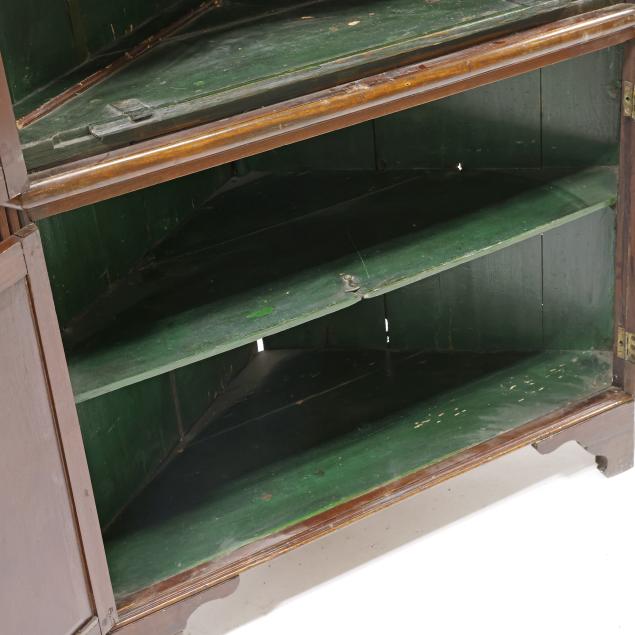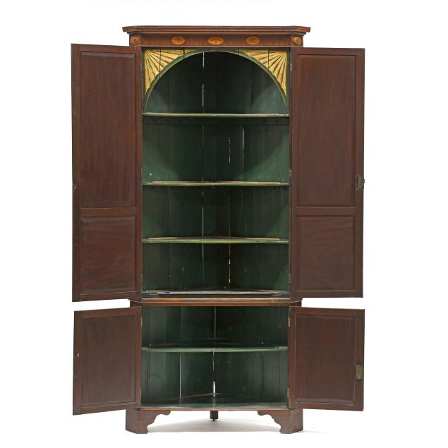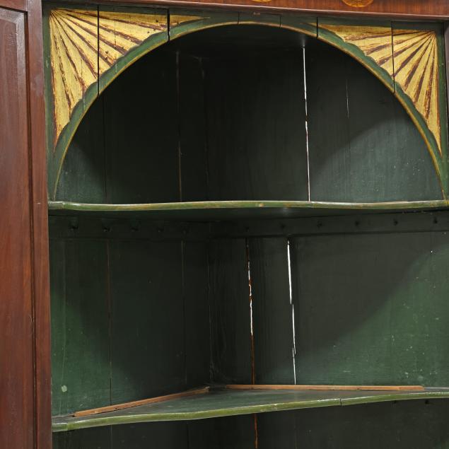 Circa 1800, two part form, pine secondary, projecting molded cornice, frieze with five inlaid floral paterae, the upper case with two tall hinged double paneled doors with molded frame, dark green painted interior with three butterfly shelves with applied dish rails, arched frieze with gilt painted fan corners, the waist board with hinged edge, the base with two hinged paneled doors with repeating molded edges, shelved interior, canted corners with bold stop fluted panels, shaped bracket foot base.