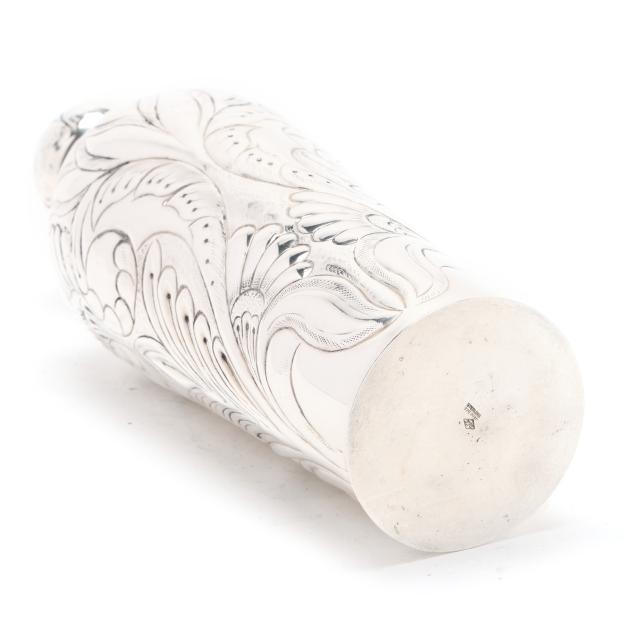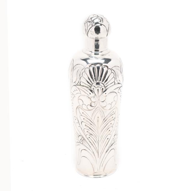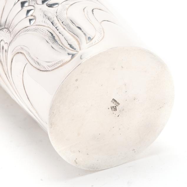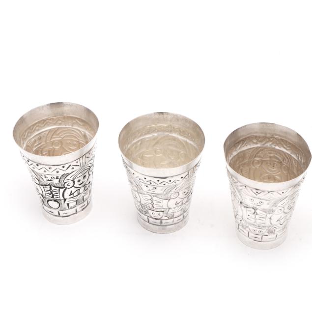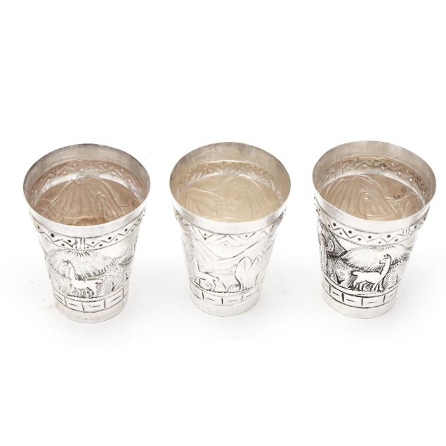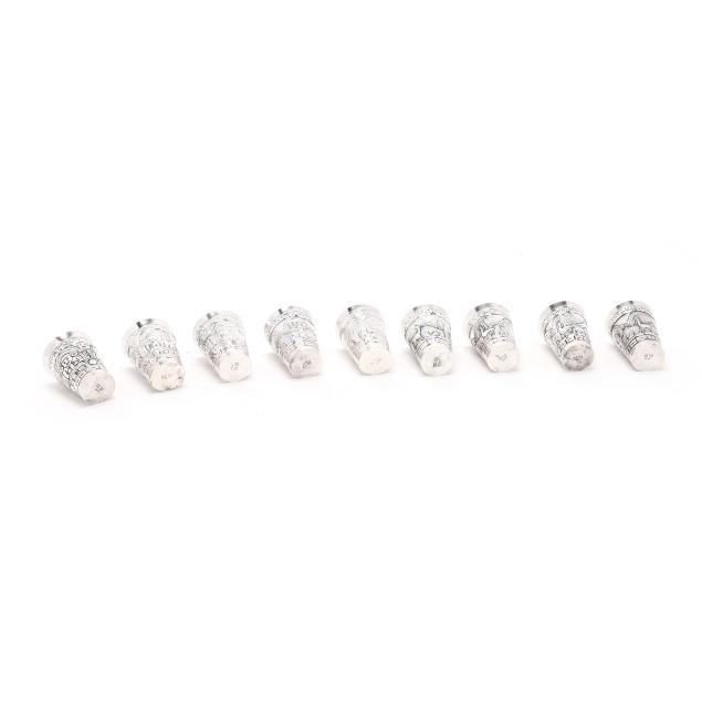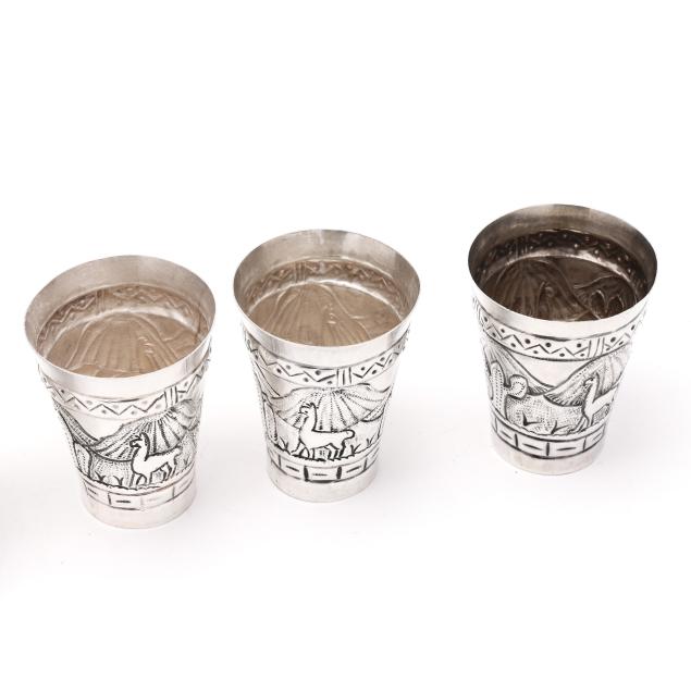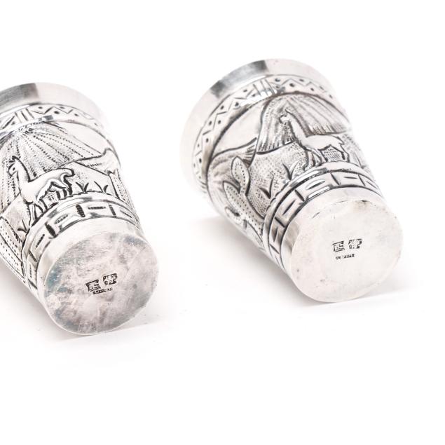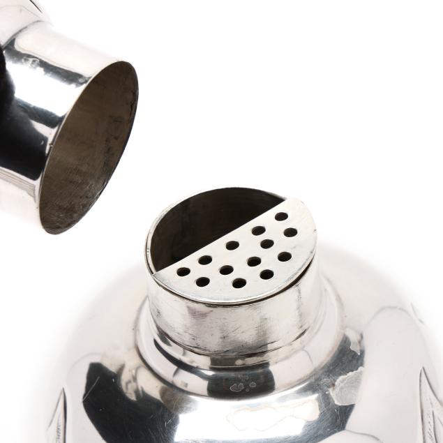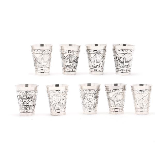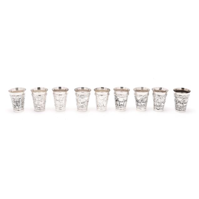 The shaker, with allover hand-chased repousse foliate designs, the lid opening to reveal strainer top (11 1/2 in.); the (9) cups with alternating figural and landscape designs (2 3/4 in.), not monogrammed.