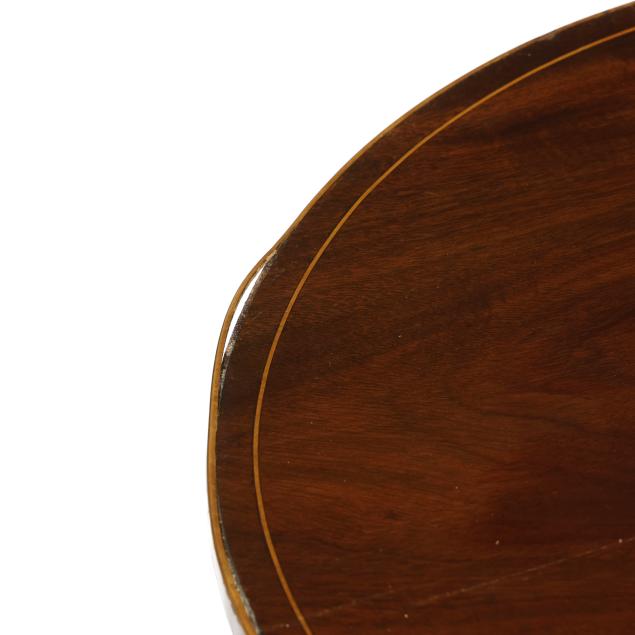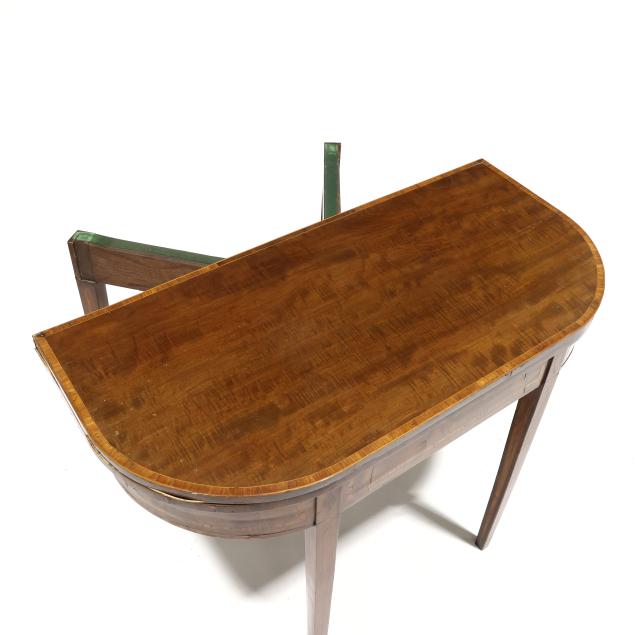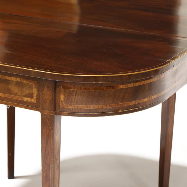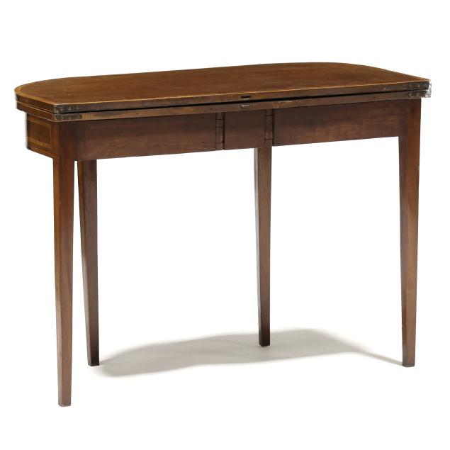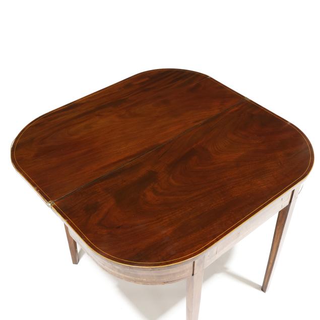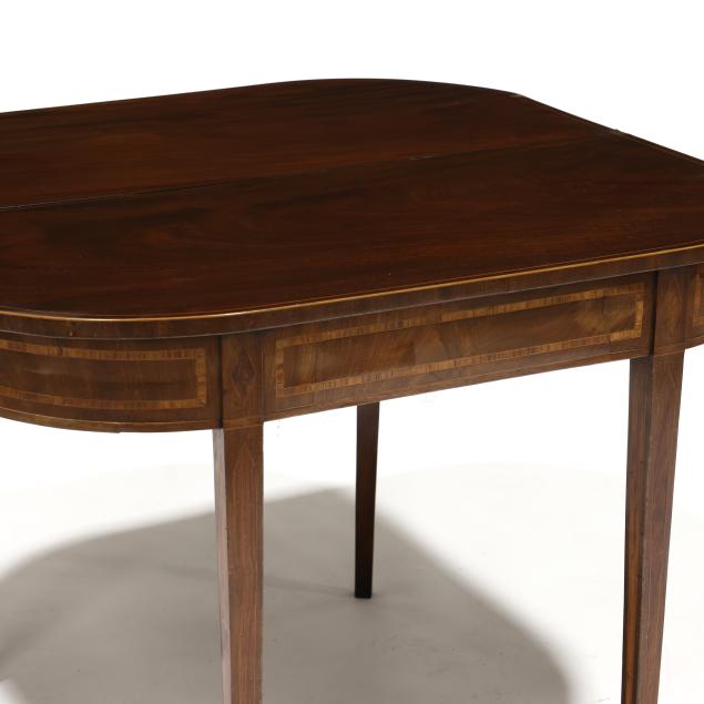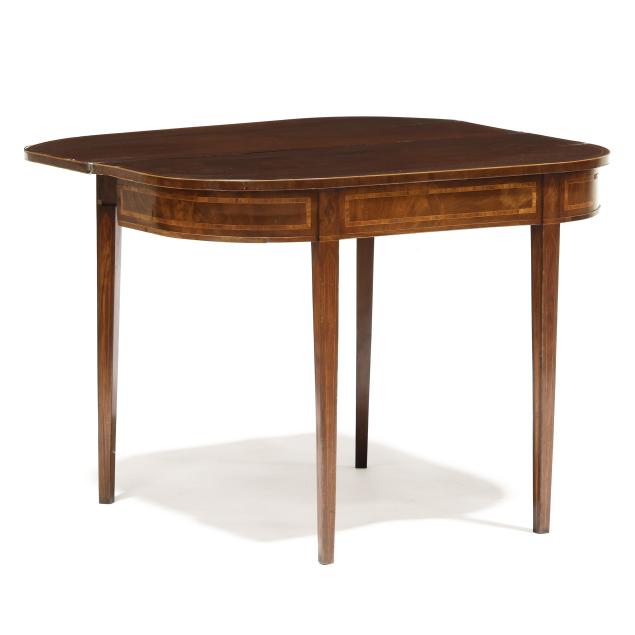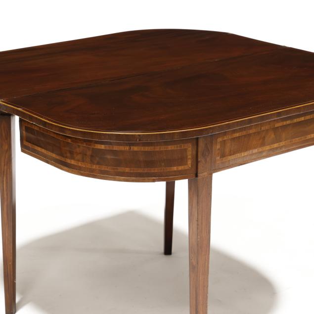 Late 18th century, mahogany veneer with light and dark wood inlays, oak and white pine secondary, D-shaped top with banded inlay, inlaid edge, double gate-leg support, banded inlay interior, banded skirt, straight tapered legs with distinctive elongated coffin inlay.