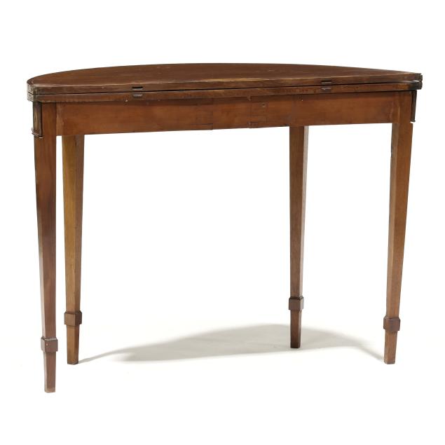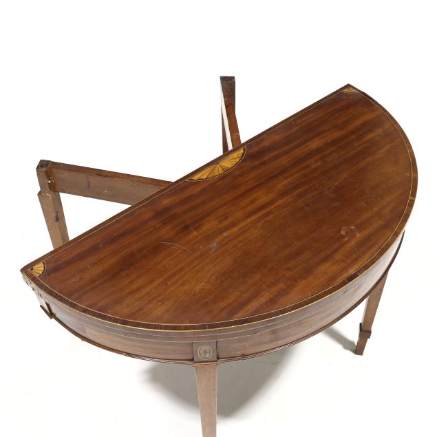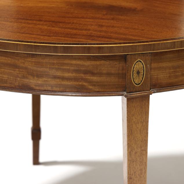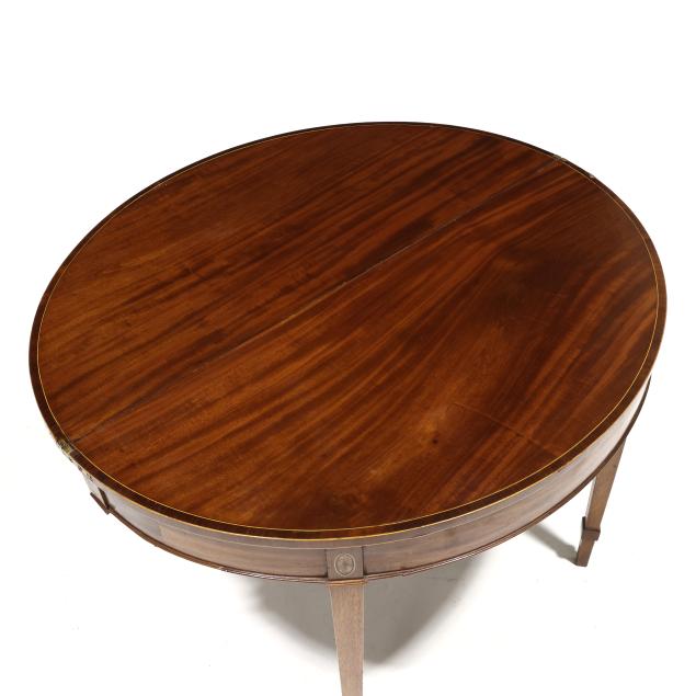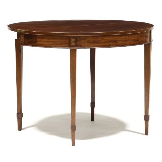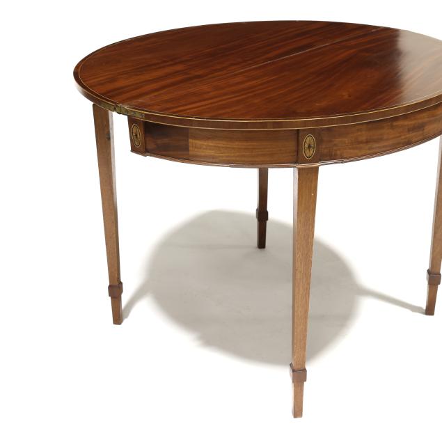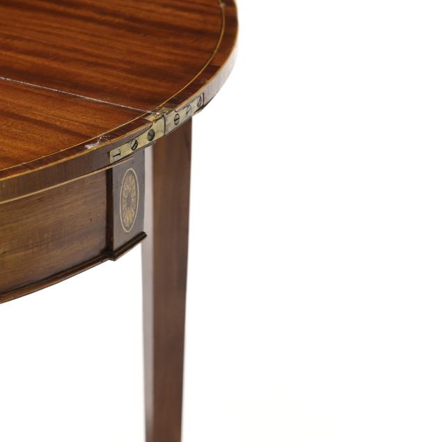 Circa 1780, mahogany, mahogany veneer with light and dark wood inlays, white pine secondary, the top with banded line and edge inlay, repeating to the hinged interior and supported by double gate-legs, applied molded edge at base of skirt, paterae inlaid stiles, straight tapered legs with applied cuff.