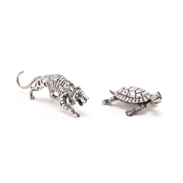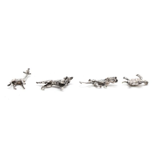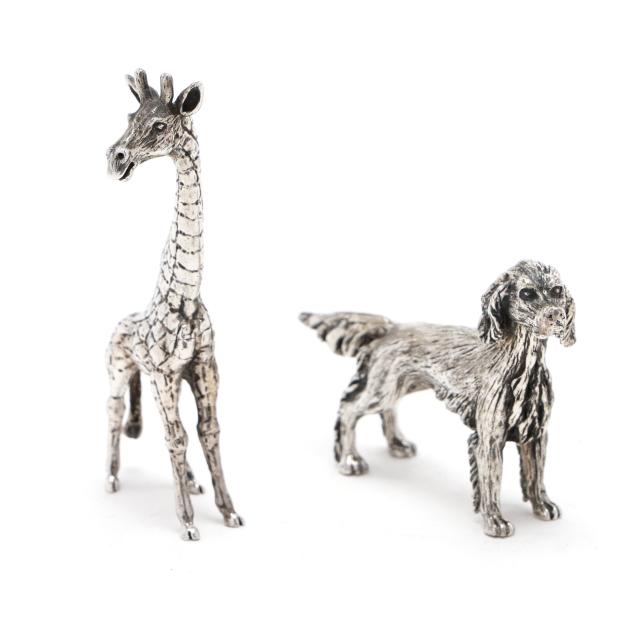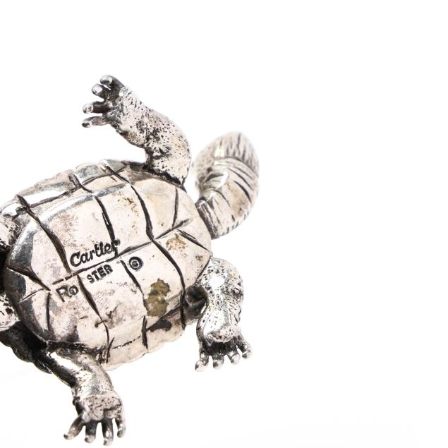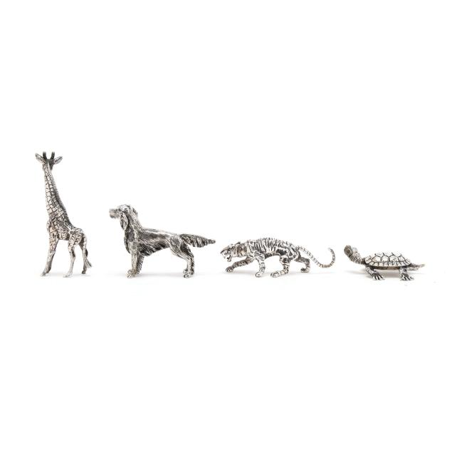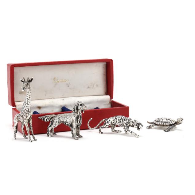 Late 20th century, all marked "Cartier / Ster," includes a giraffe, turtle, tiger, and spaniel, not monogrammed, presented with a Cartier retail box.