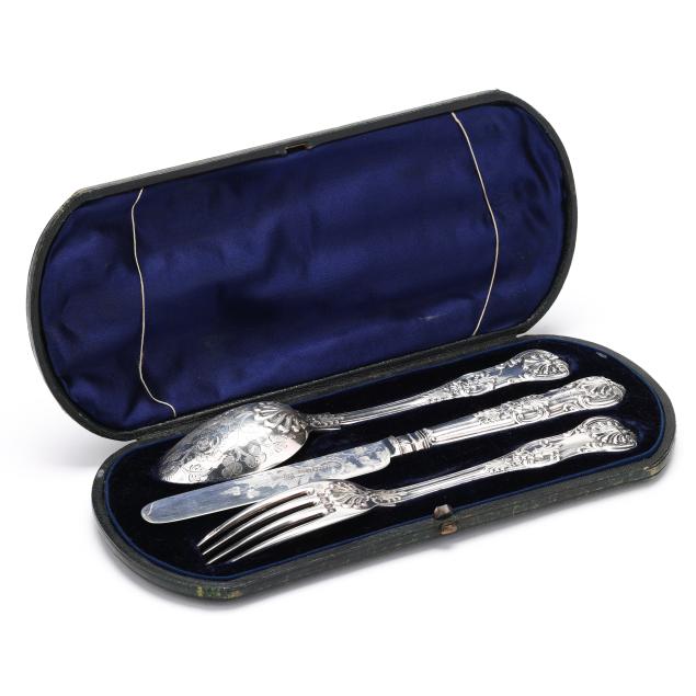 Mark of Martin, Hall & Co., Sheffield (1862 and 1863), in the Kings pattern, the knife and spoon with ornate engraved decoration, with "TB" monograms presented in the original fitted retail case.