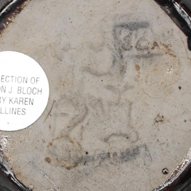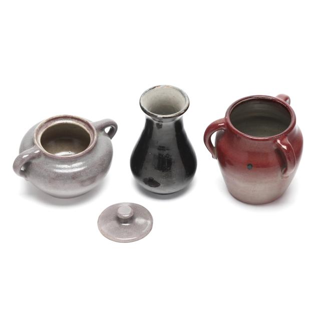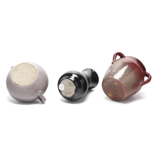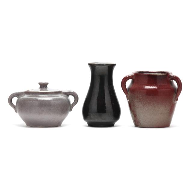 Arden, North Carolina, vitreous semi-porcelain stoneware with applied glazes, to include a three handled vase in copper red reduction glaze 5 x 5 1/2 x 5 1/2 in.) and a covered sugar in a pale violet glaze (4 x 6 1/2 x 5 in.), circa 1920s; the third in rare black glaze, 1932 "potter at the wheel" mark, retaining collection label of Collection Milton J. Bloch and Marty Karen Vellines (5 3/4 x 3 1/2 x 3 1/2 in.).