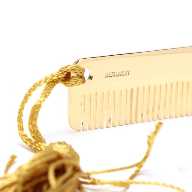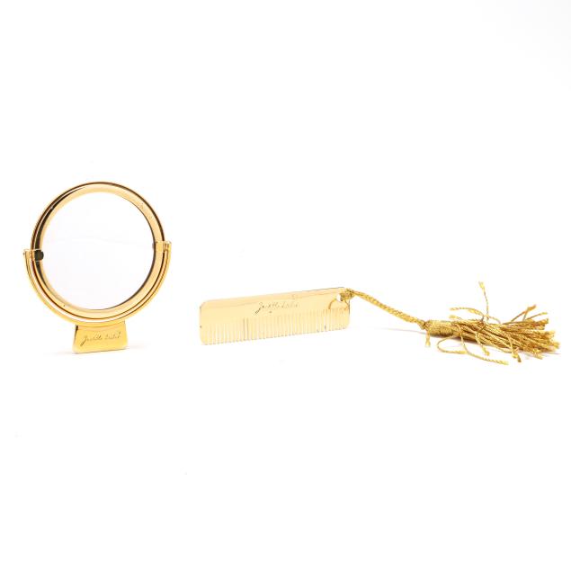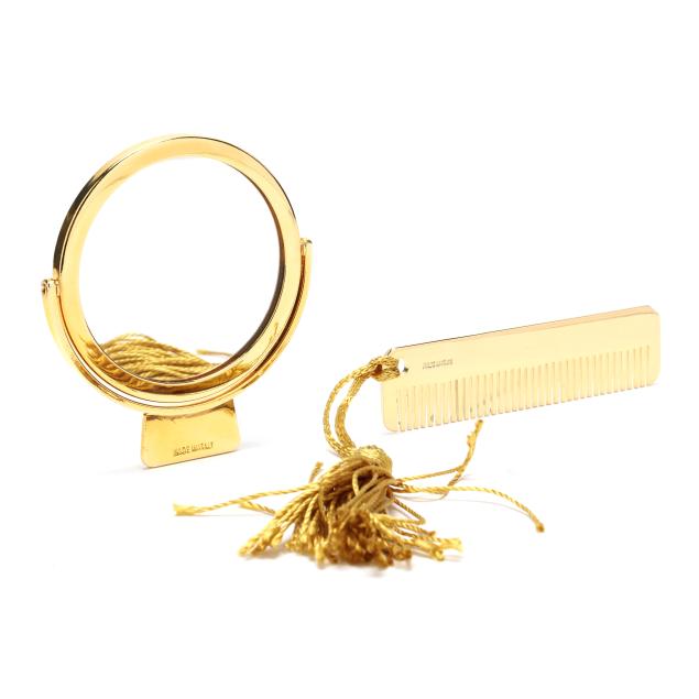 The exterior in black alligator with gold-tone metal trim, framed handle, and top clasp, the interior in black leather with an open side pouch and a zipper pocket, and with a metal brand plate, mirror, comb, and care paperwork.